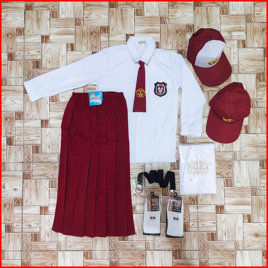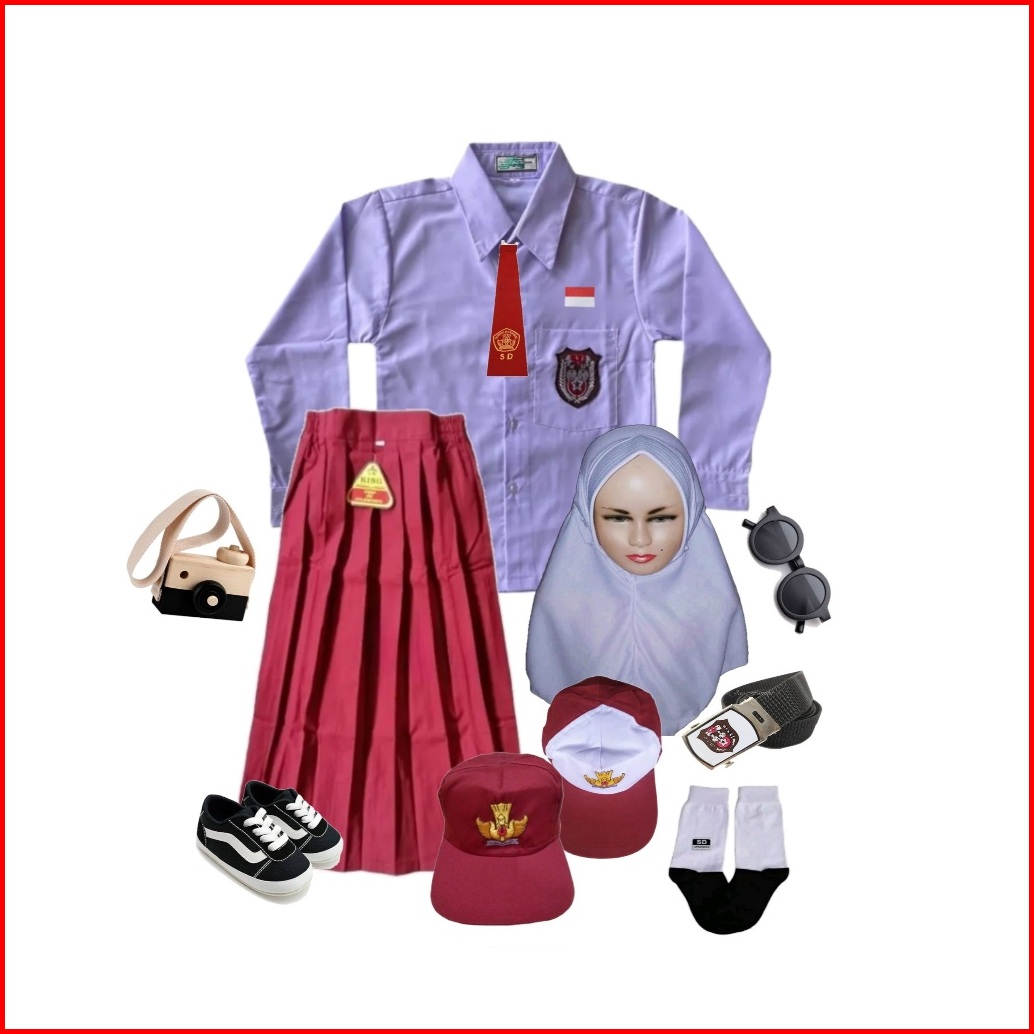 Seragam Merah Putih Sd Panjang Setelan Anak Perempuan Kelas 1-6 Sd Free Topi Jilbab Putih