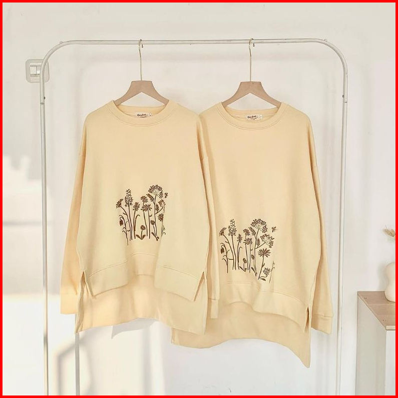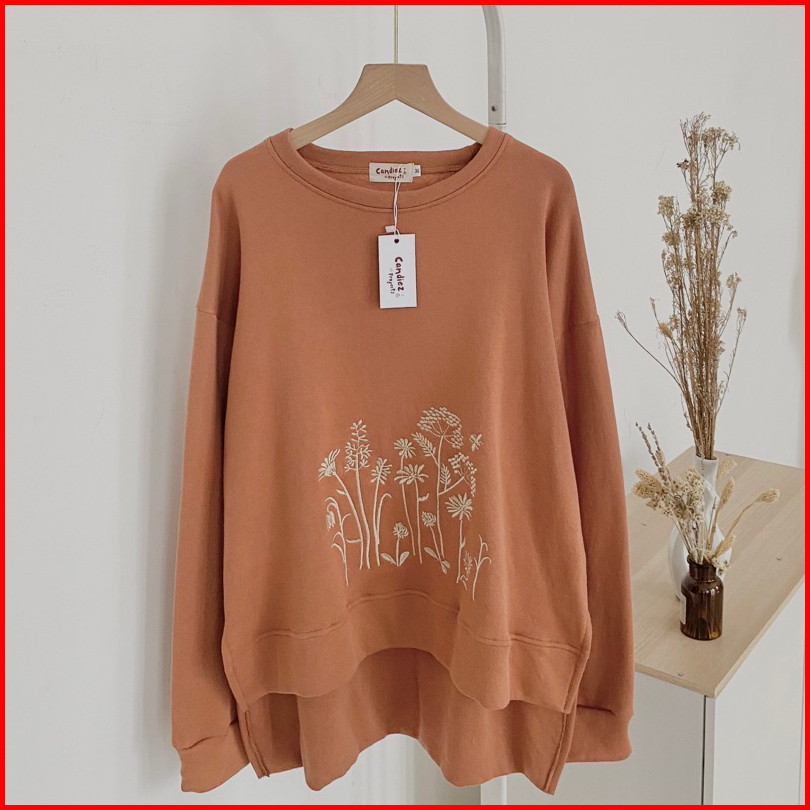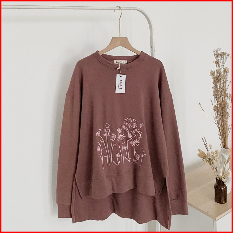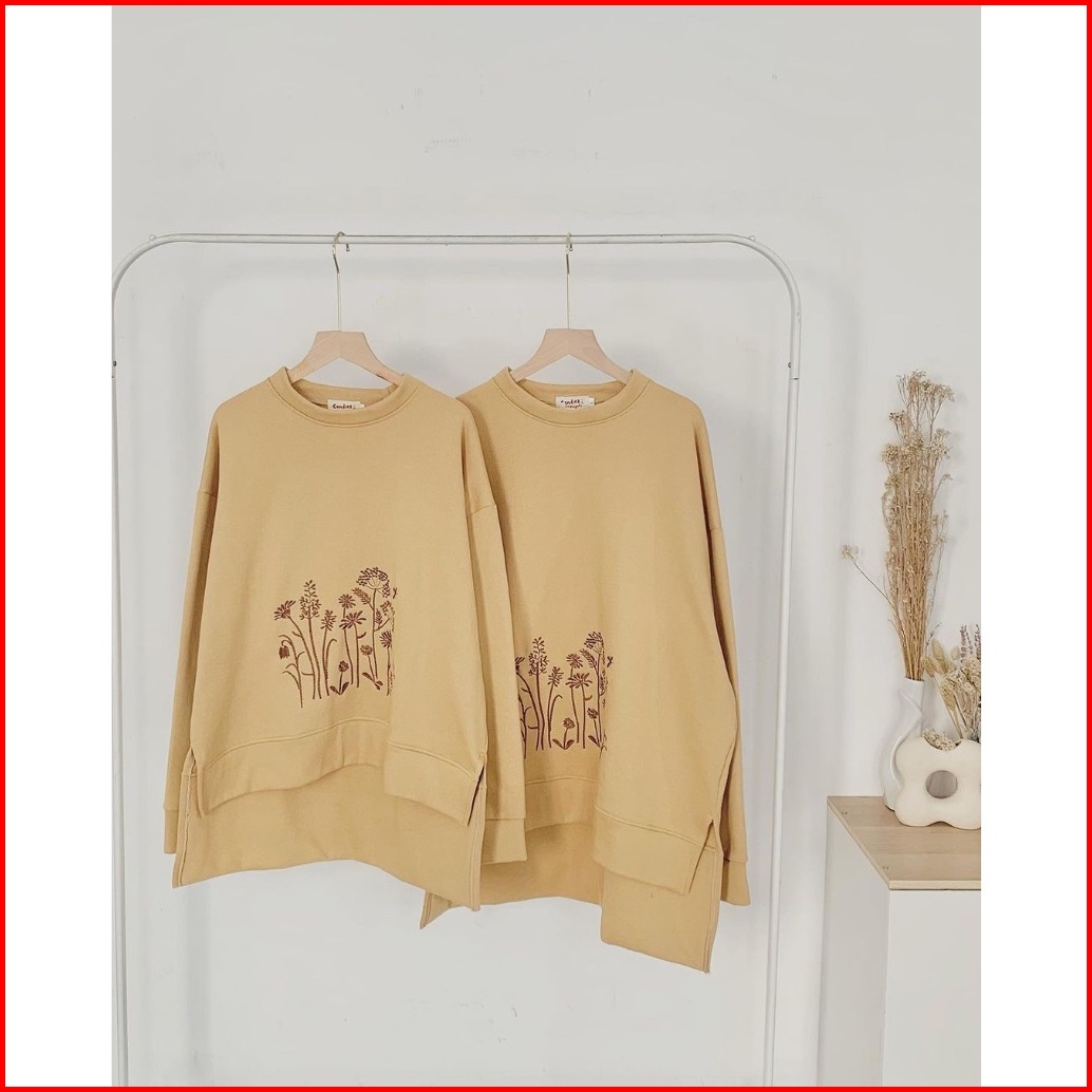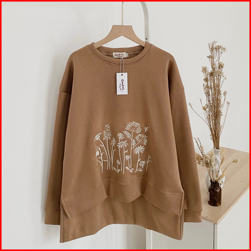Candiez Sunny Embroidery Slit Top Sweater Slit Tebal Lembut Fleece Embroidery Bordir Bunga