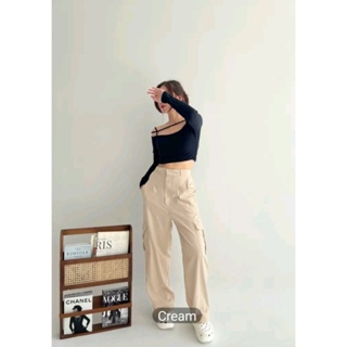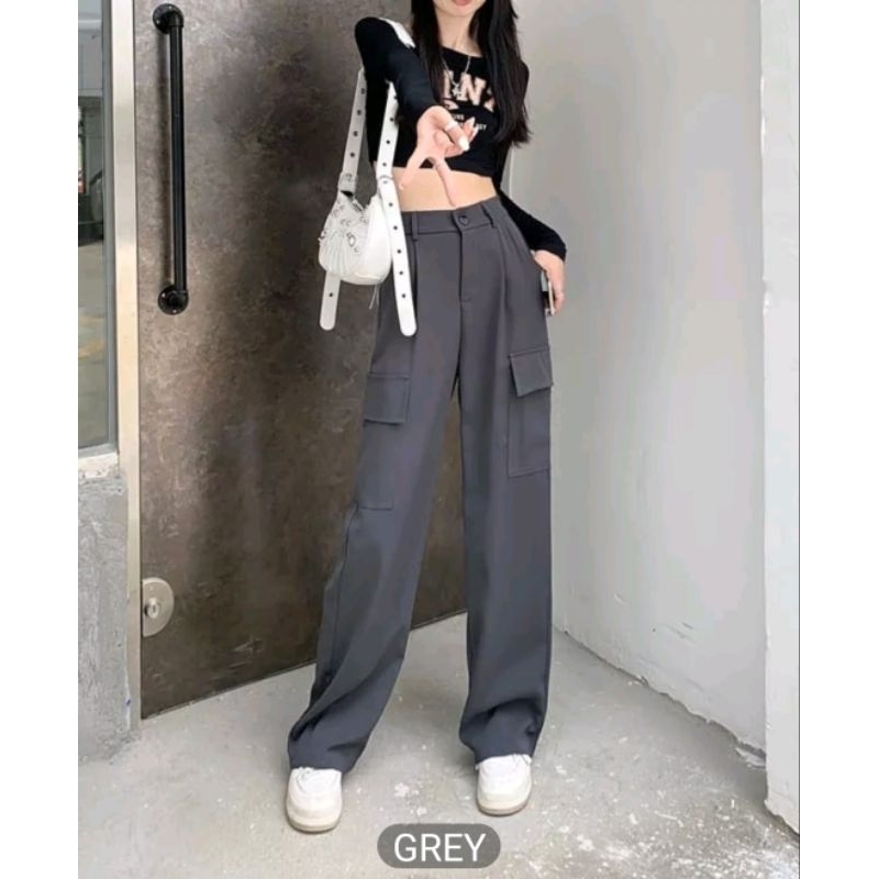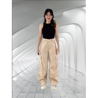 (Gratis Ongkir) Celana Premium Cargo Pants Wanita Highwaist Casual Kekinian Korean Style Celana Panjang Kulot Hitam