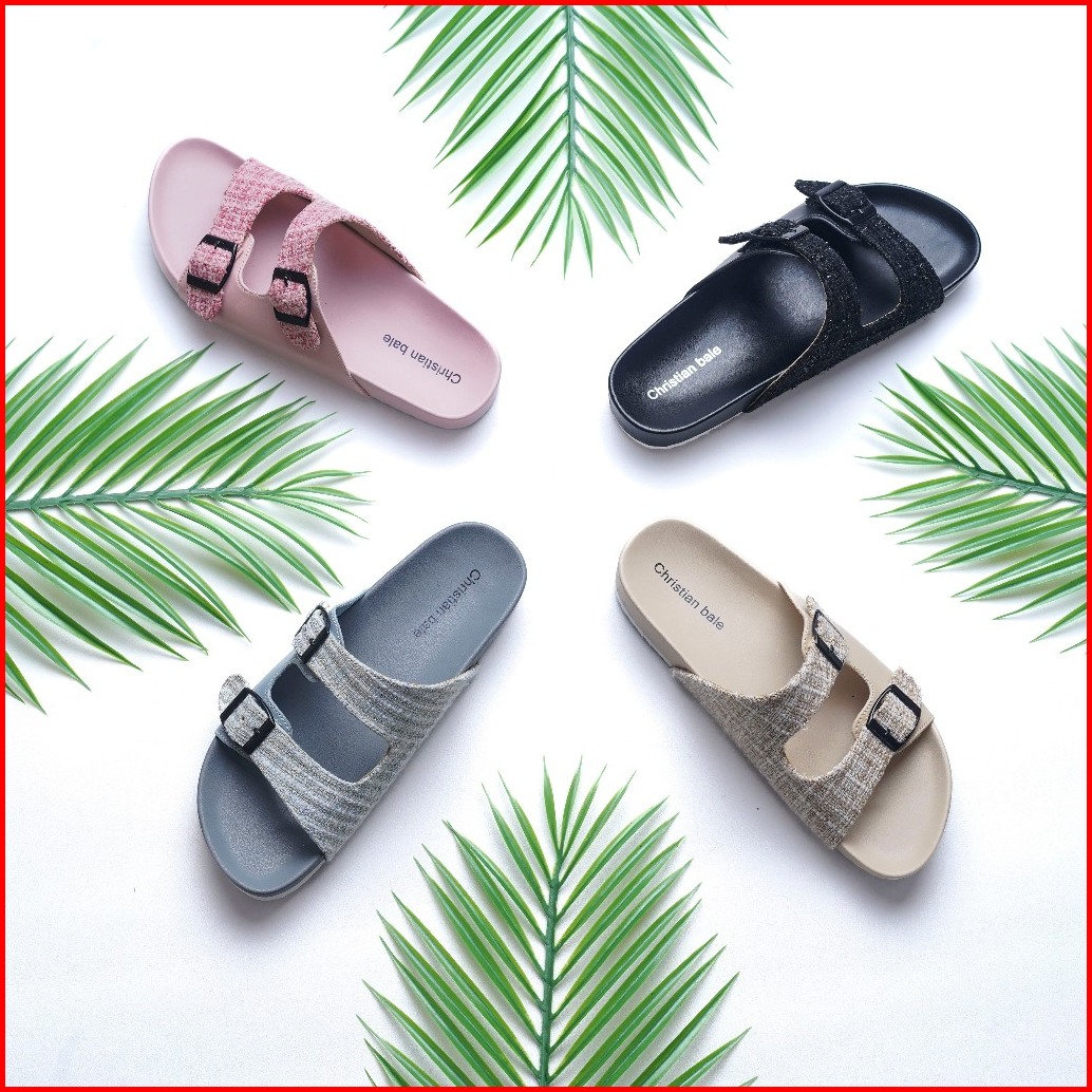Christian Bale Olin Sandal Wanita Kekinian Sendal Flat Cewek Casual Bahan Canvas Gesper Terbaru