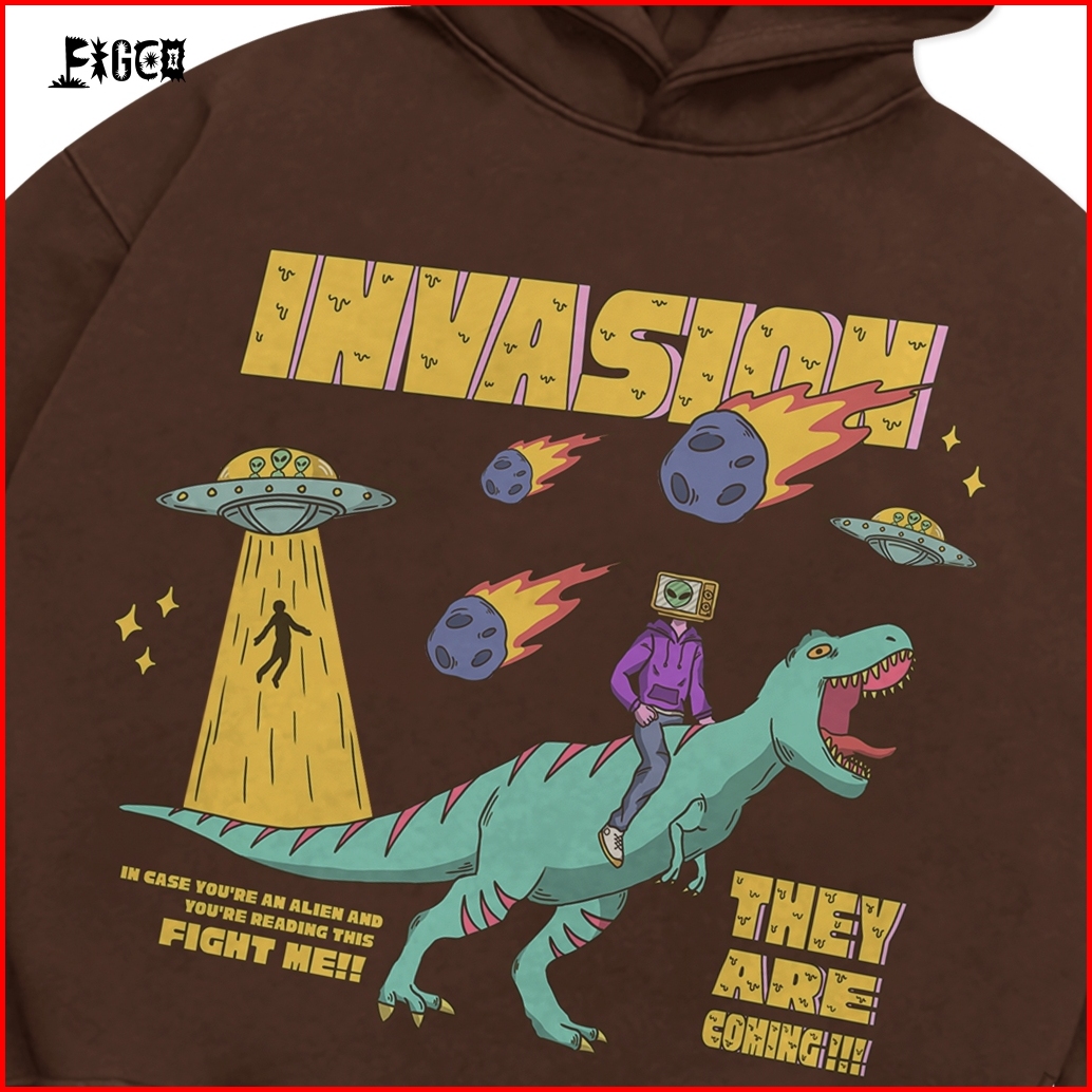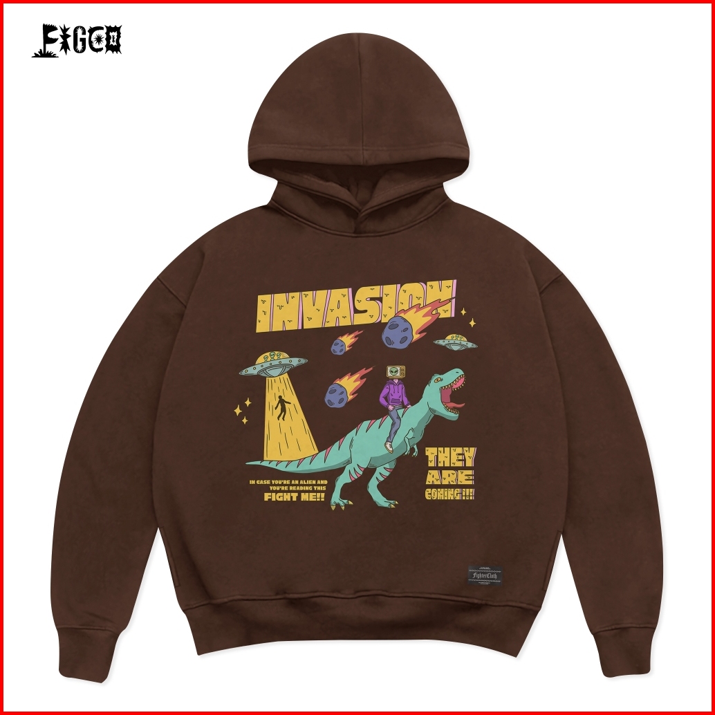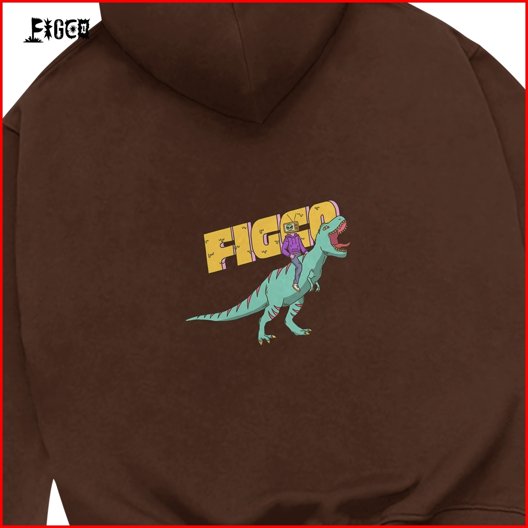 Figco - Hoodie Boxy Oversize Coklat Fleece Premium Pullover Dino Invasion Brown
