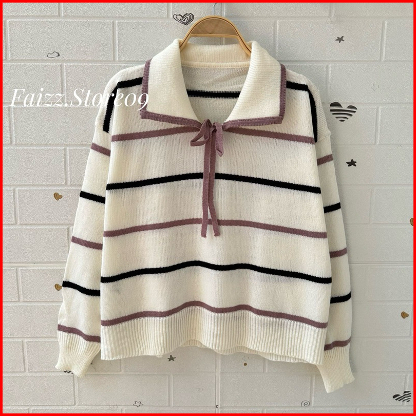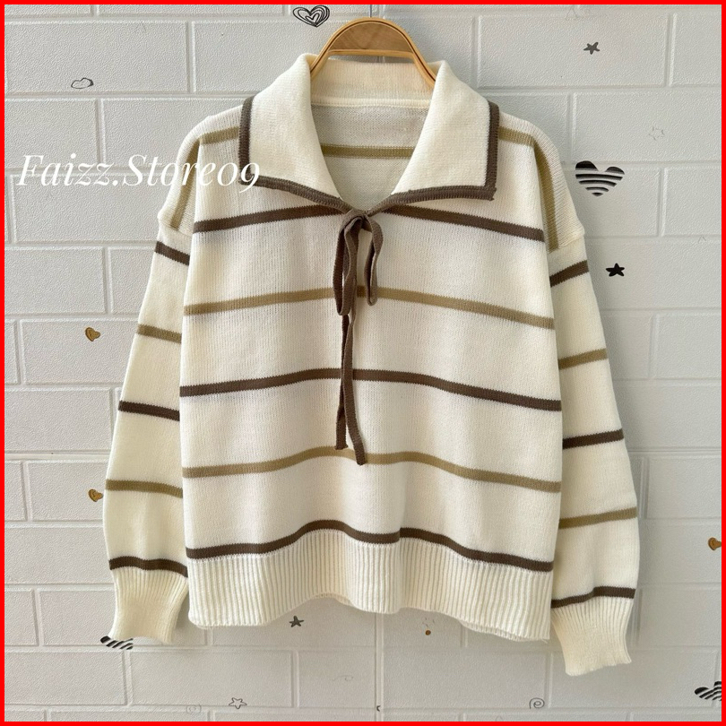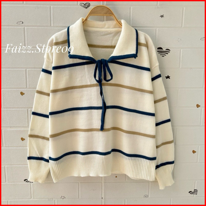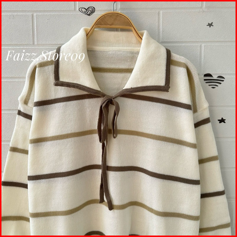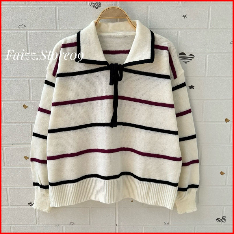 Laras Atasan Polo Kancing Tali Sweater Rajut Wanita Motif Garis Kerah Premium Lengan Panjang
