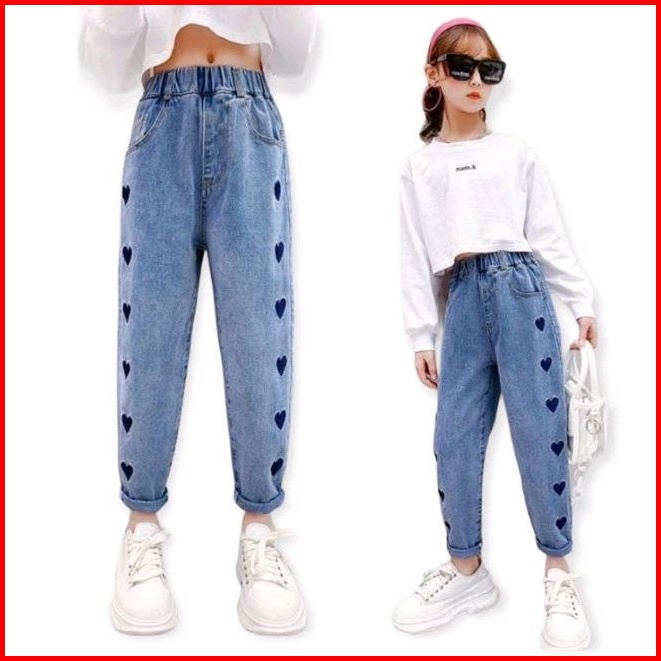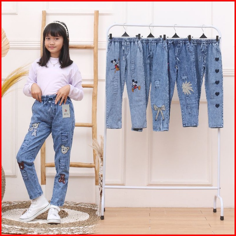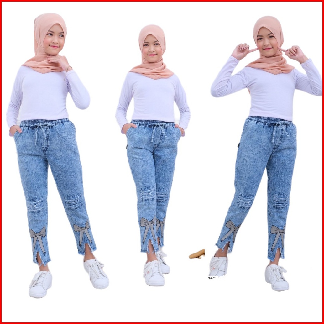 Celana Jeans Aksen Bordil Love Pita Boneka Bunga Cempaka Warna Light Snow Terbaru Best Seller Usia 7 Tahun 8 9 10 11 Sam