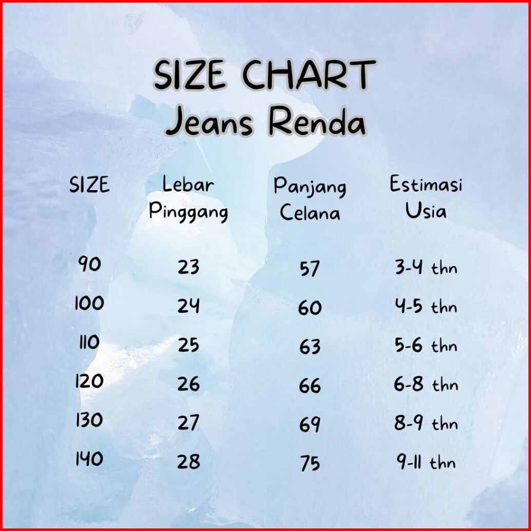 Size 90(3-4 tahun), Size 100(4-5 tahun), Size 110(5-6 tahun), Size 120(6-8 tahun), Size 130(8-9 tahun), Size140(9-11 tahun)