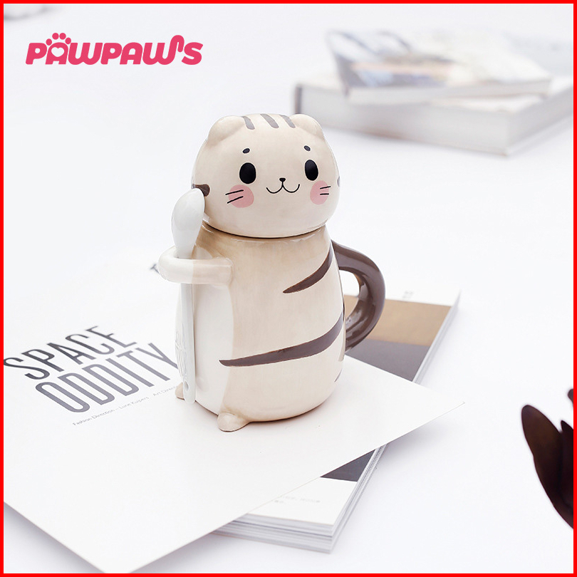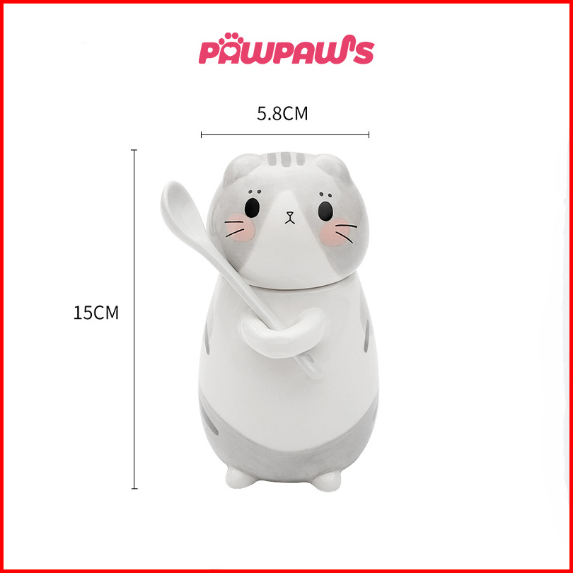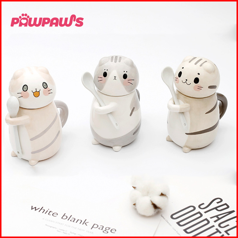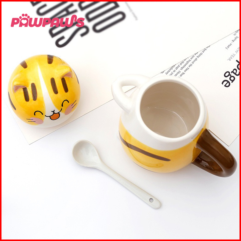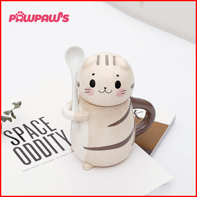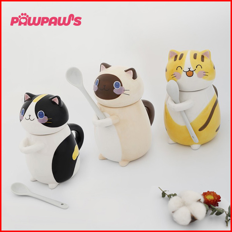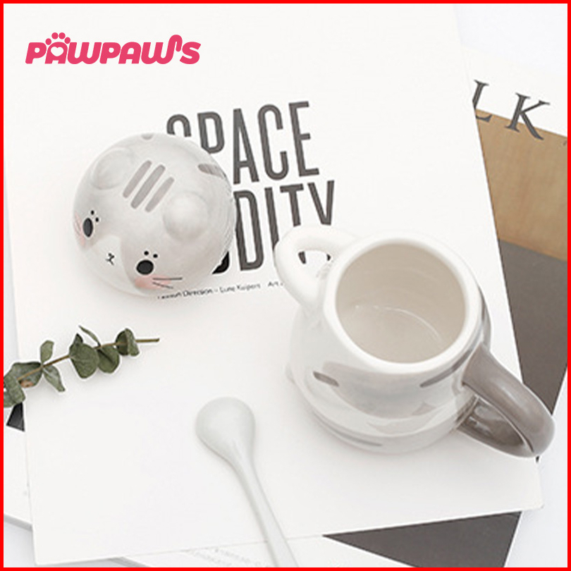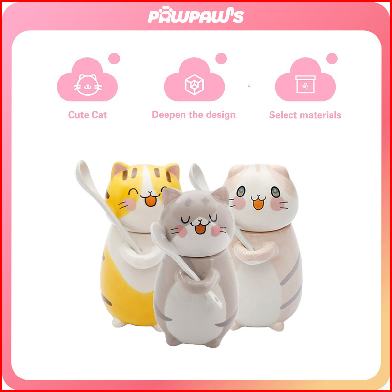 Pawpaw Gelas Keramik Kucing Lucu - Cat Mug Susu Atau Kopi Dengan Tutup Dan Sendok 275ml Pp-aab6061