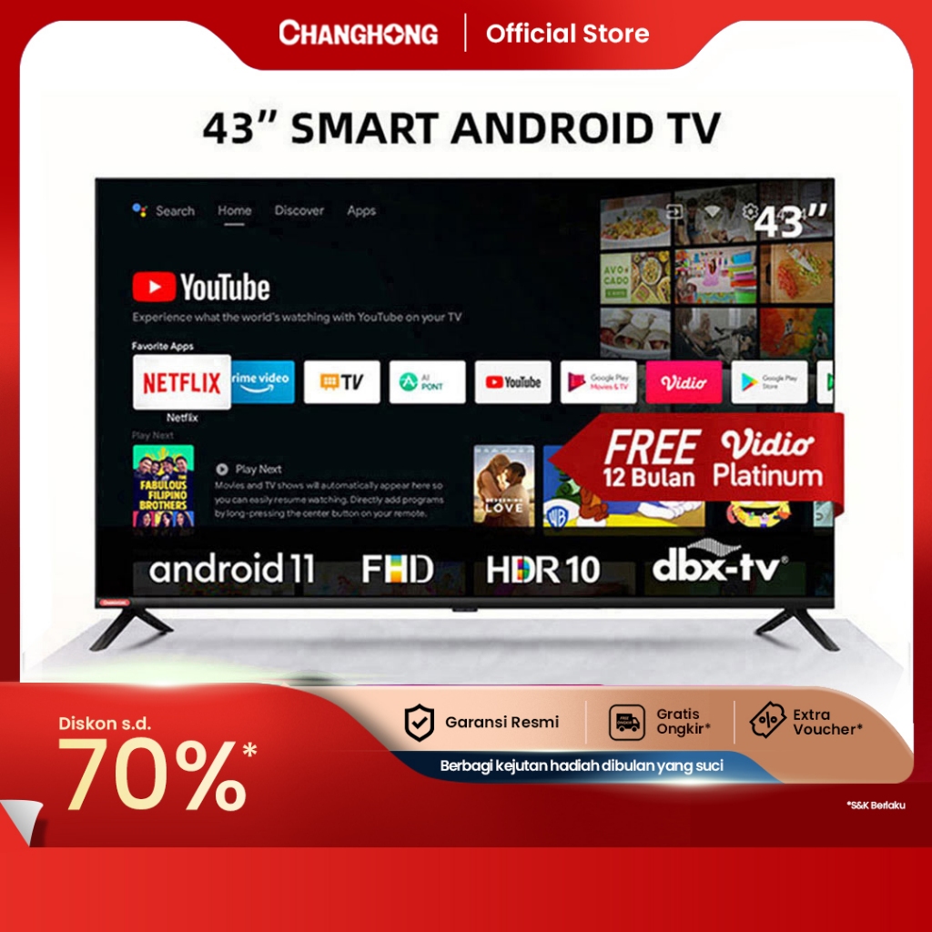 Changhong 43 Inch Newest Android 11 Frameless Smart TV Digital LED TV FHD -Netflix-Youtube-Google Playstore (L43G7N)