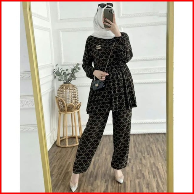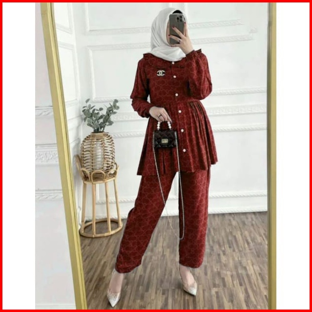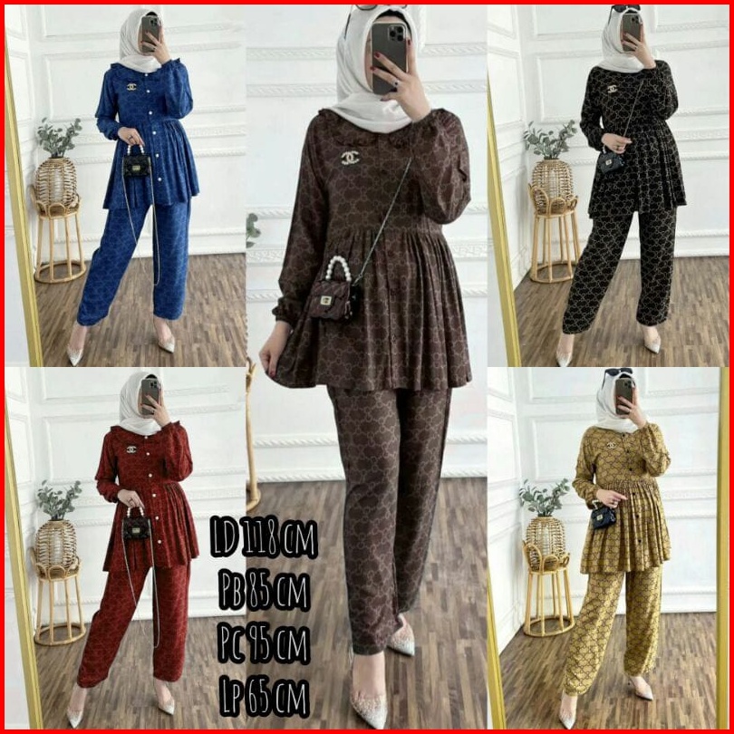 Naureen One Set Panjang Motif Viral Kekinian Kancing Depan Lengan Panjang Karet Bumil Busui