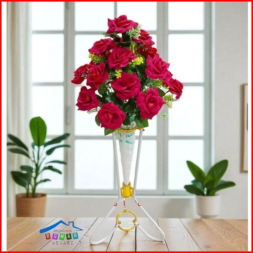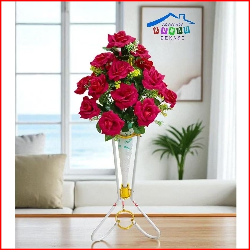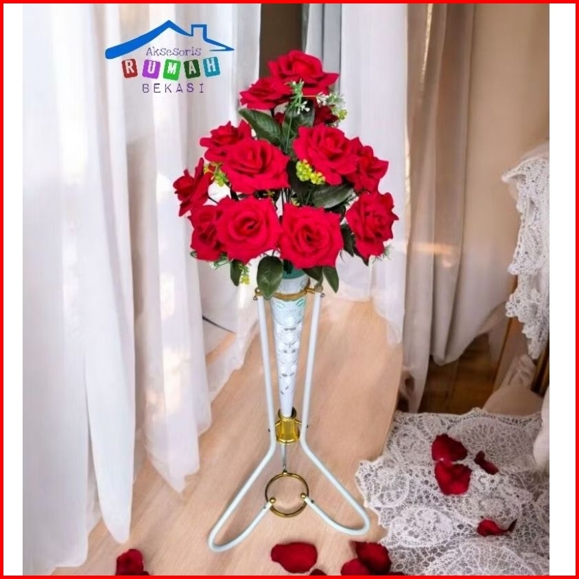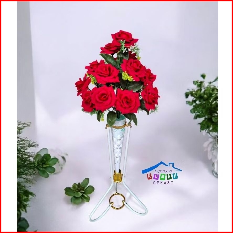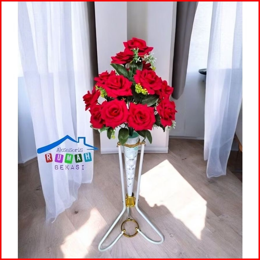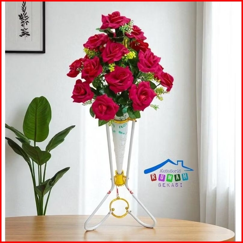 Bunga Mawar Beludru Mekar 18 Kuntum Dengan Pot Standing Besi Import