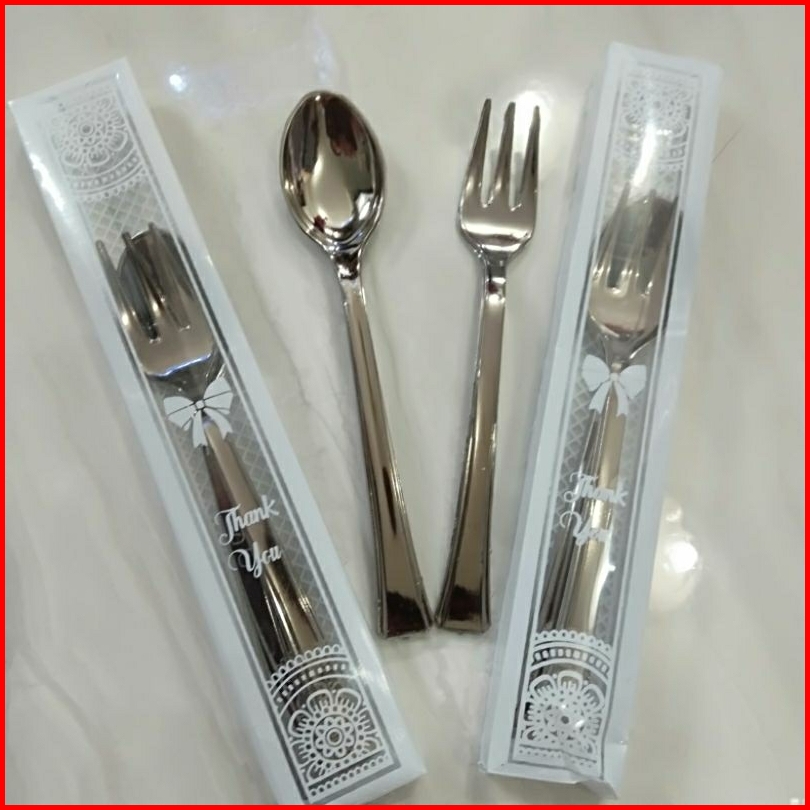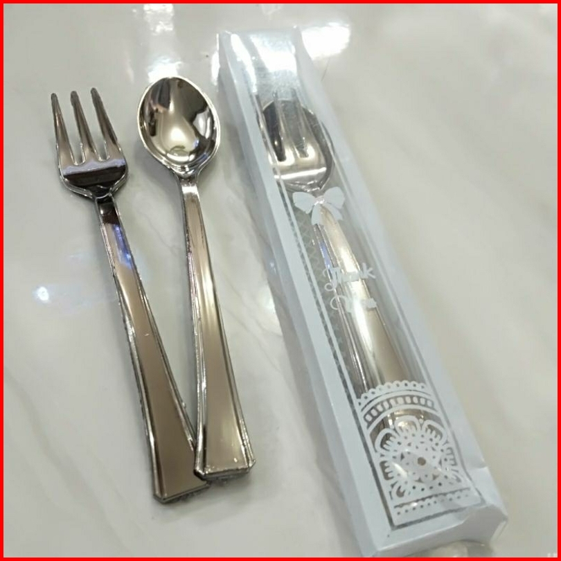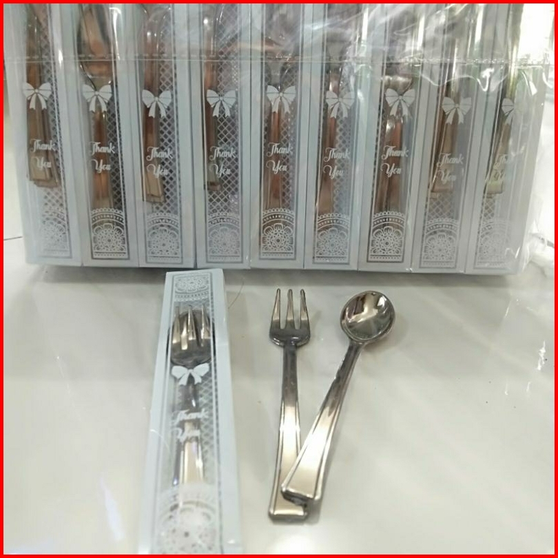 Isi 50 Pcs Souvenir Pernikahan Sendok Garpu Puding Silver Kemas Mika Cantik