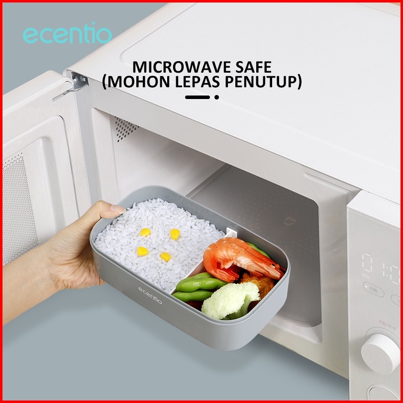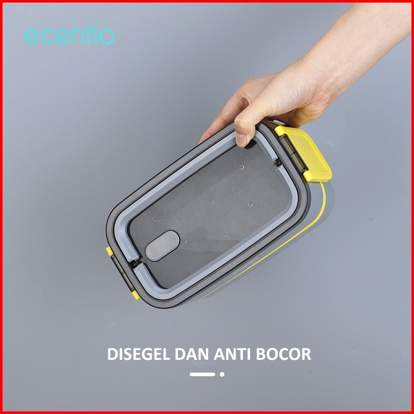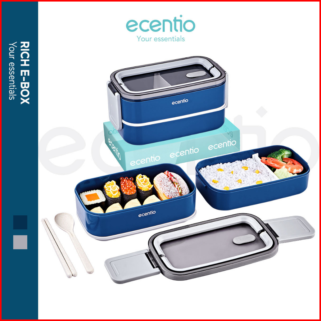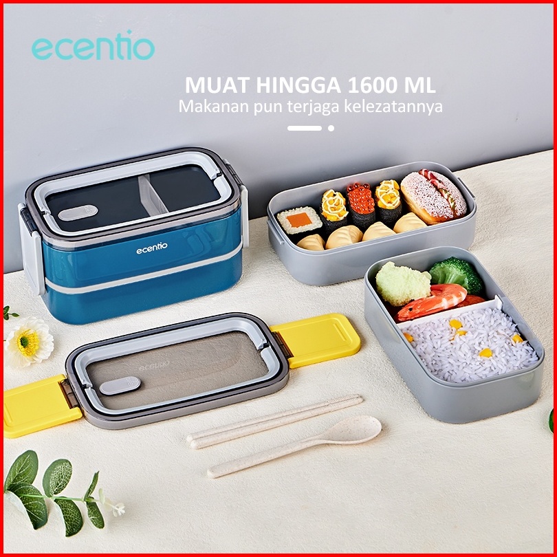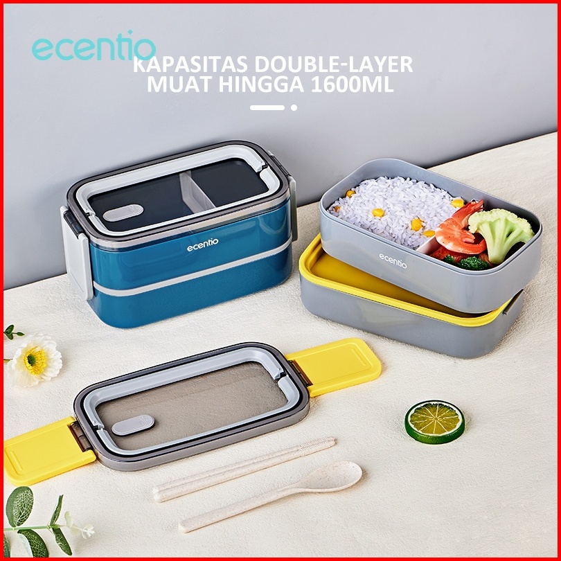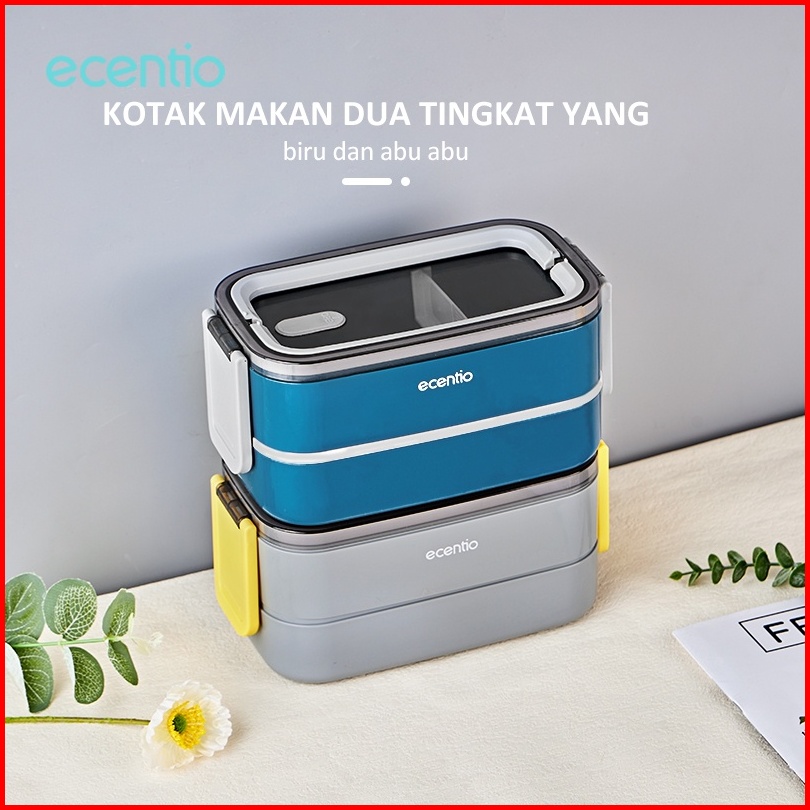 Ecentio Lunch Box Kotak Tempat Bekal Anti Bocor Makan 1600ml Double Layer Abu-abu Biru Free Sendok Dan Garpu