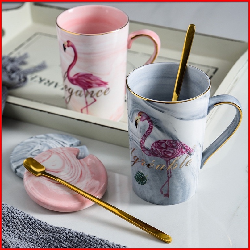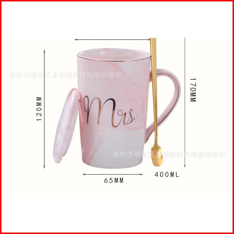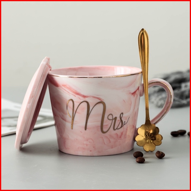 Gelas Keramik Marbel Mr Mrs Gelas Kopi Dengan Sendok Dan Tutup