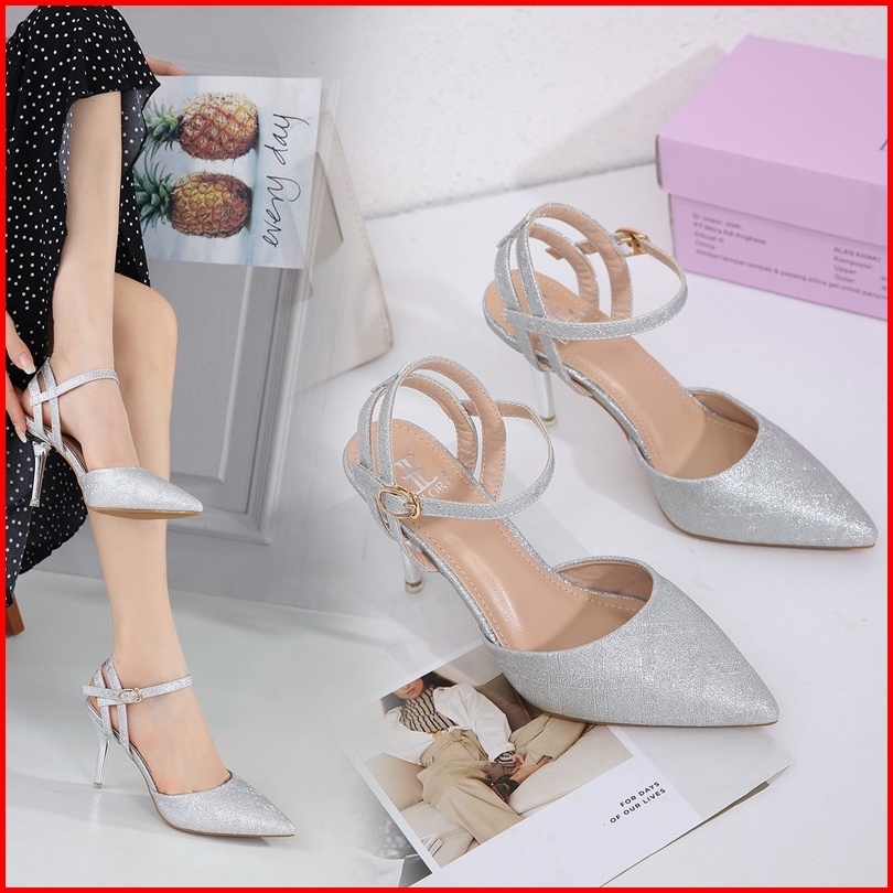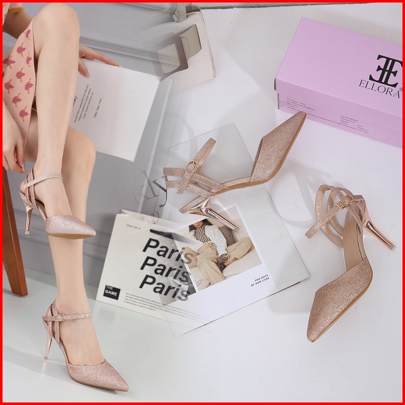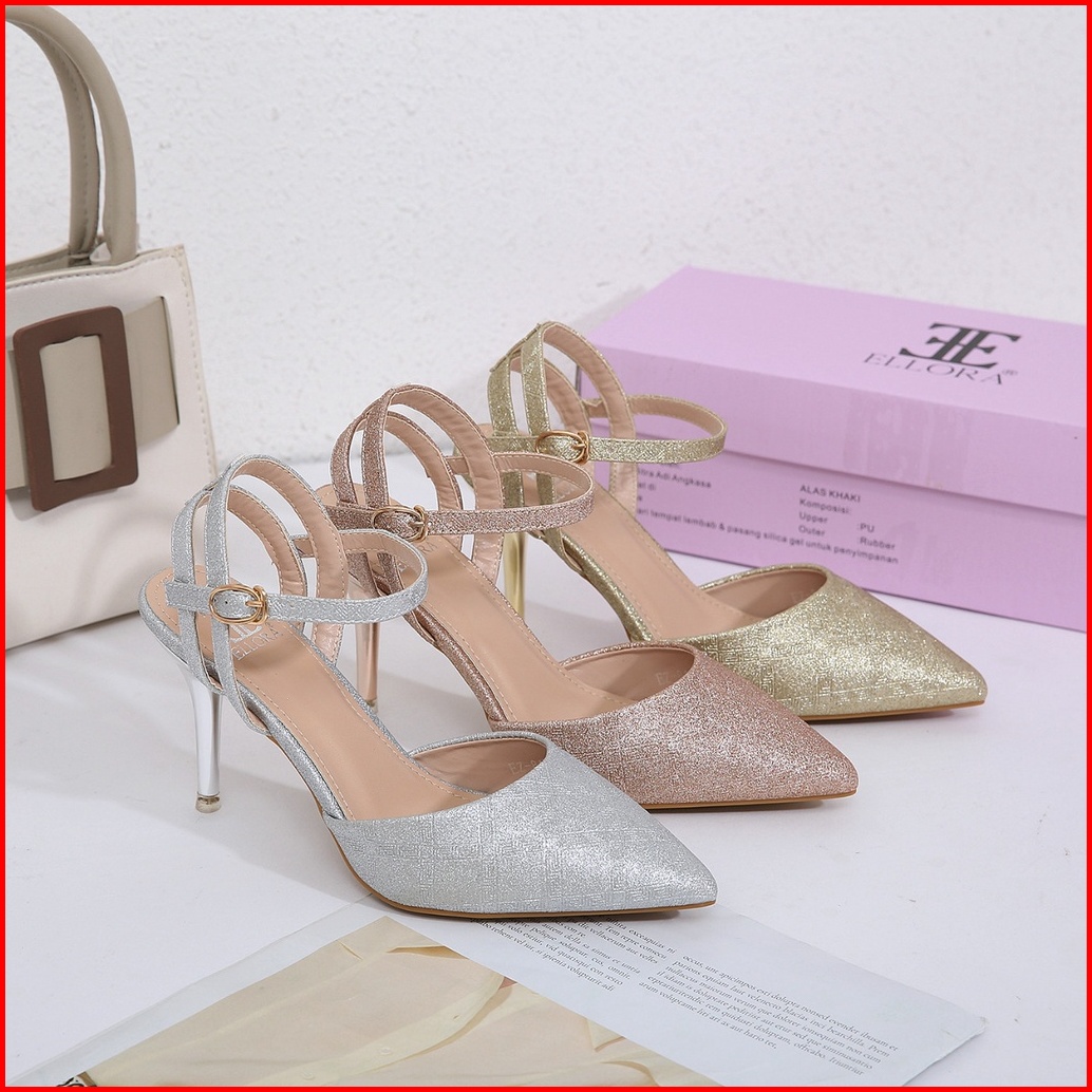 Ellora Ez-8415 Sepatu Heels Pesta Wanita 8.5 Cm Ankle Strap Bahan Kanvas Glitter Import