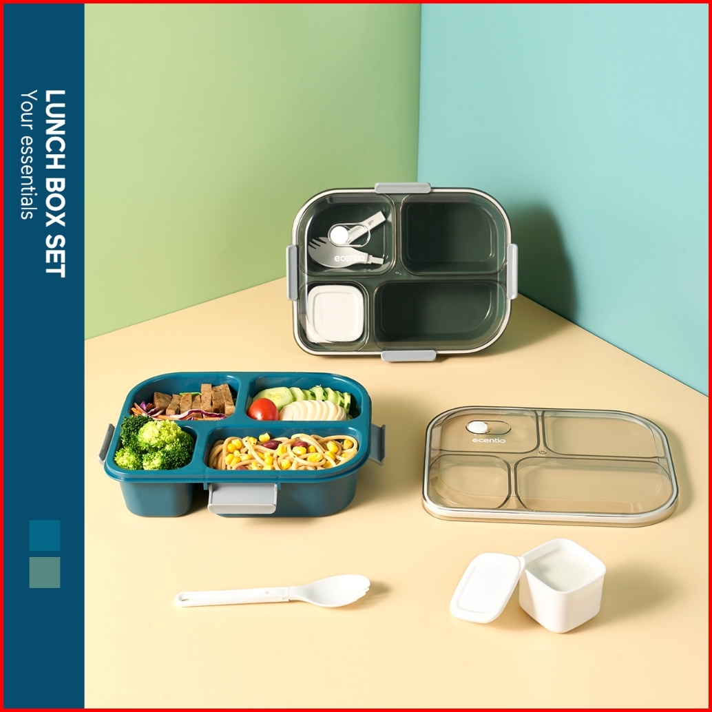 Ecentio Kotak Makan Lunch Box Set Anti Bocor 4 Grid Dengan Dengan Kotak Sup Dan Sendok Gratis Anti Tumpah Berbahan 1100m