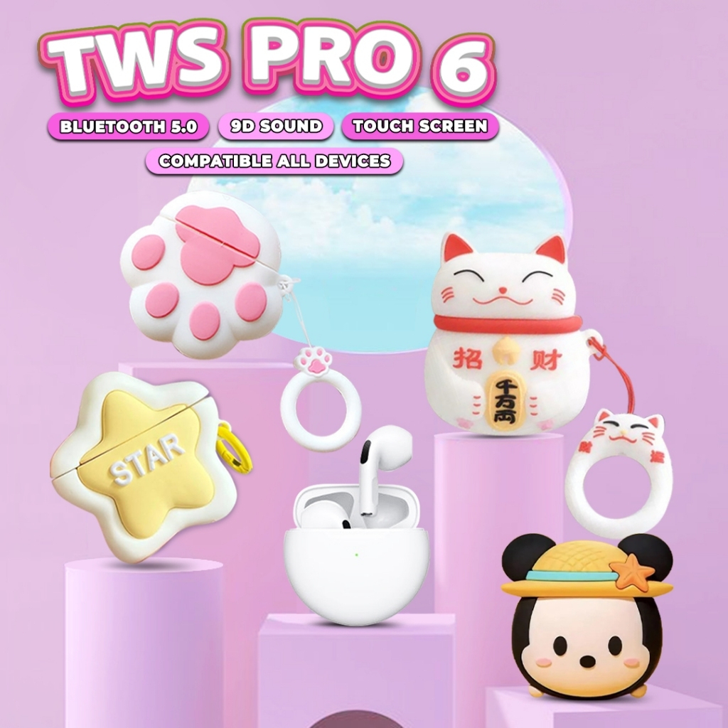 Mocho TWS Pro6 Headset Bluetooth Bass 9D HiFi Stereo Sound Earphone Wireless Waterproof Headphone Henset with 3D Kartun