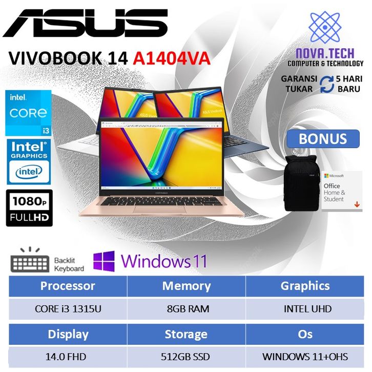 Asus Vivobook Go 14 A1404VA Intel Core i3 1315 Ram 8Gb 512Gb Ssd Windwos 11 + OHS 14.0fhd Gen13th