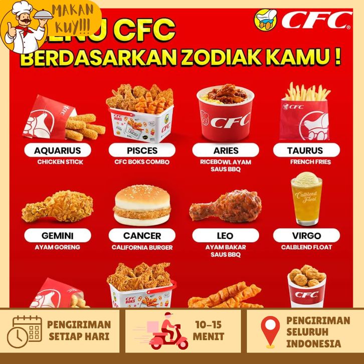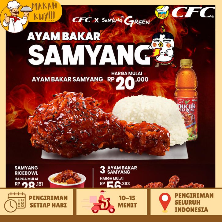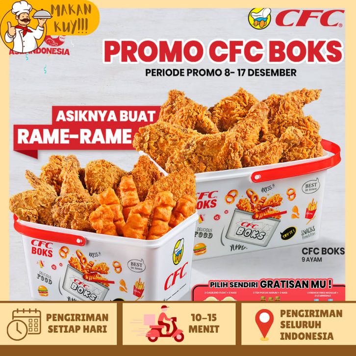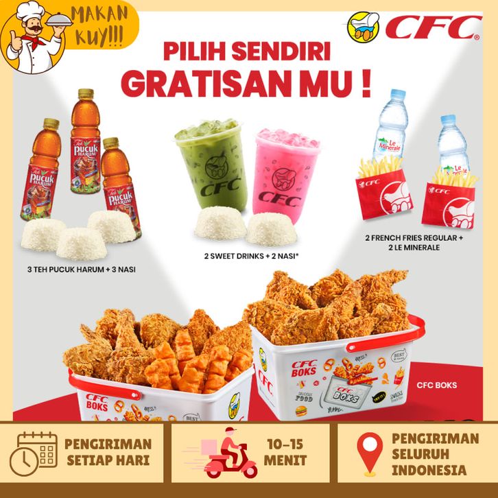 Ramadhan A, Ramadhan B, Komandan 1, Komandan 2, Komandan 3, Chocomalt Milkshake, Korean Banana Milkshake, Strawberry Milkshake, Samyang Ricebowl, Paket Samyang Ricebowl, Hebat A, Hebat B, Hebat C, Hebat D, CFC Boks Pilih Sendiri Gratisanmu, CFC Boks Combo Pilih Sendiri Gratisanmu, 4 Menu 69 Ribu, 3 Ayam, 5 Ayam, 7 Ayam, Astaga 1, Astaga 2, Astaga 3, Astaga 4, Astaga 5, CFC Boks, CFC Boks Combo, Super 5, Combo Favorit, Paket Family, Mix Combo A