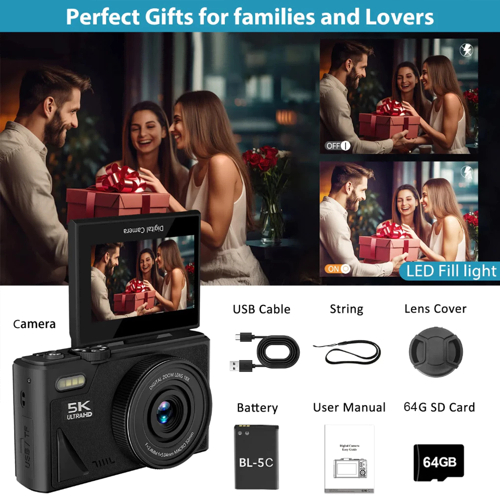5K kamera Digital WiFi 75MP Zoom 18X Layar Swafoto Flip 180° 64M -- Kamera Pocket Mini Akona Digicam 48MP LCD 2.7 Inci