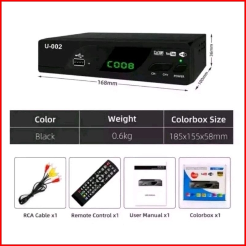 STB T2+RCA, STB HDTV Mstar, STB HDTV+RCA+HDMI, DC001+HDMI+DONGLE, Dcolor DC001+RCA, DcolorDC001+RCA+HDMI, HDTV BOX OREN+RCA, STB DC002, STB U002, T2 Sunplus, STB HDTV
