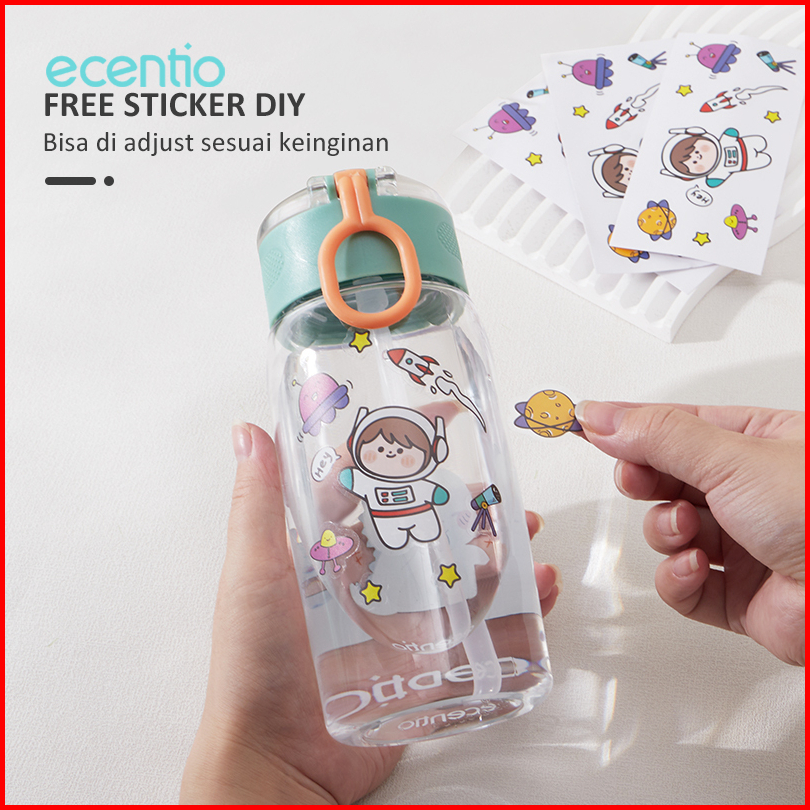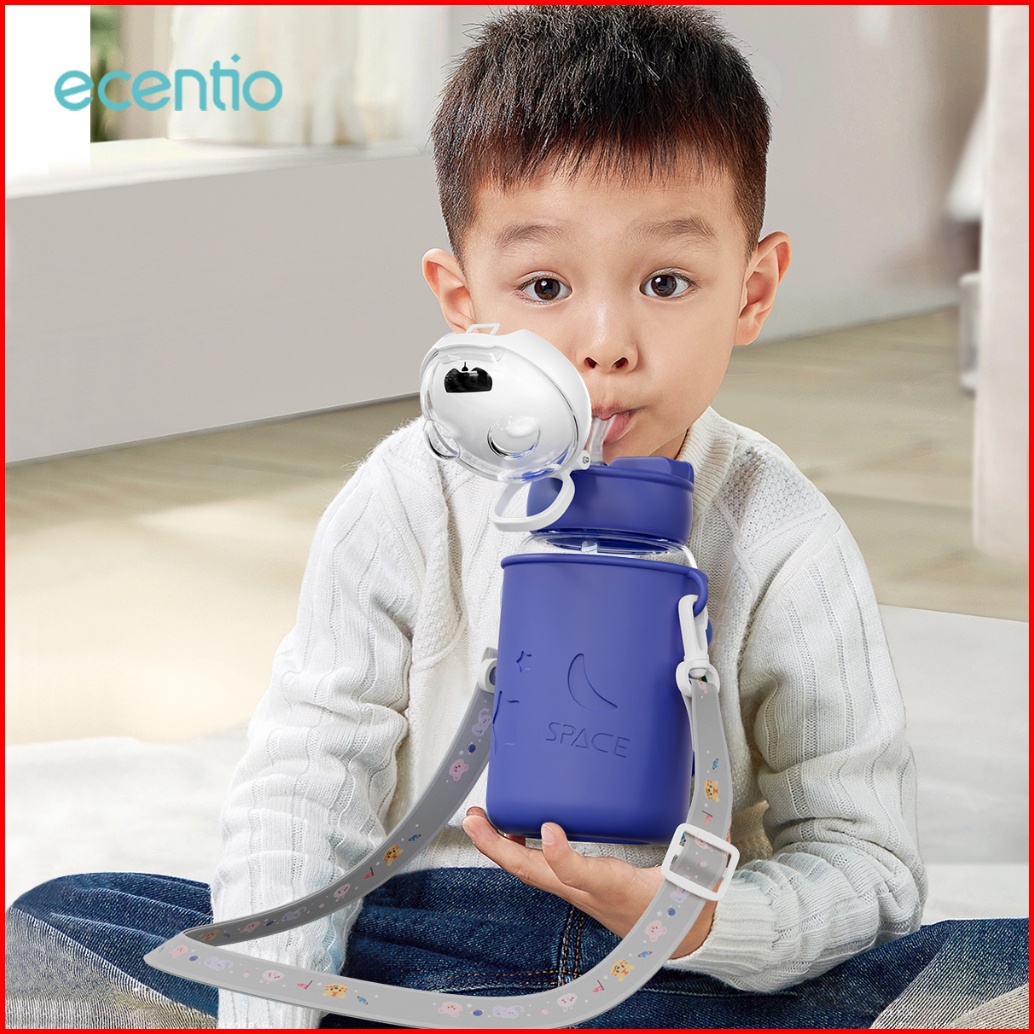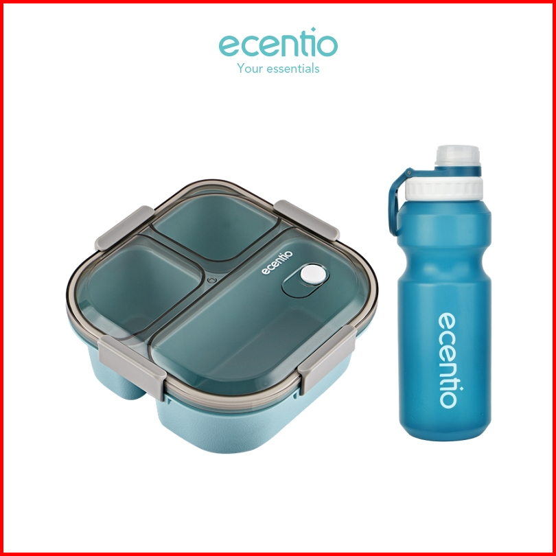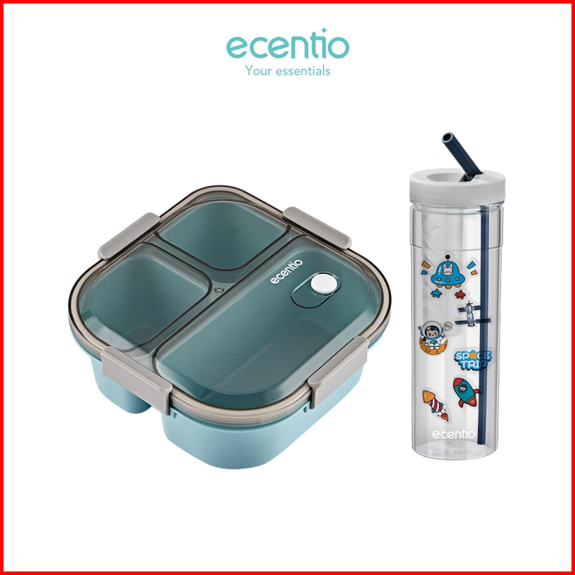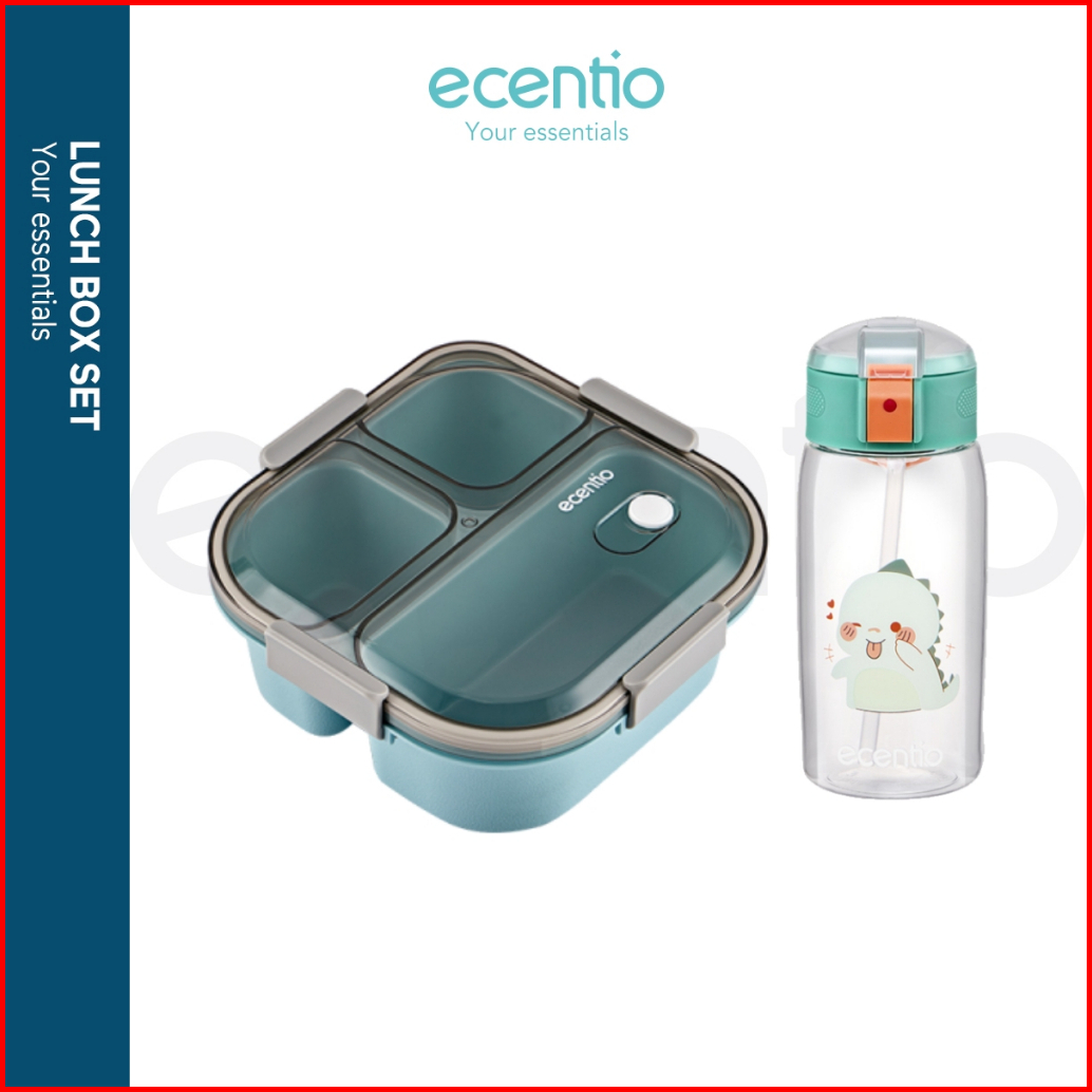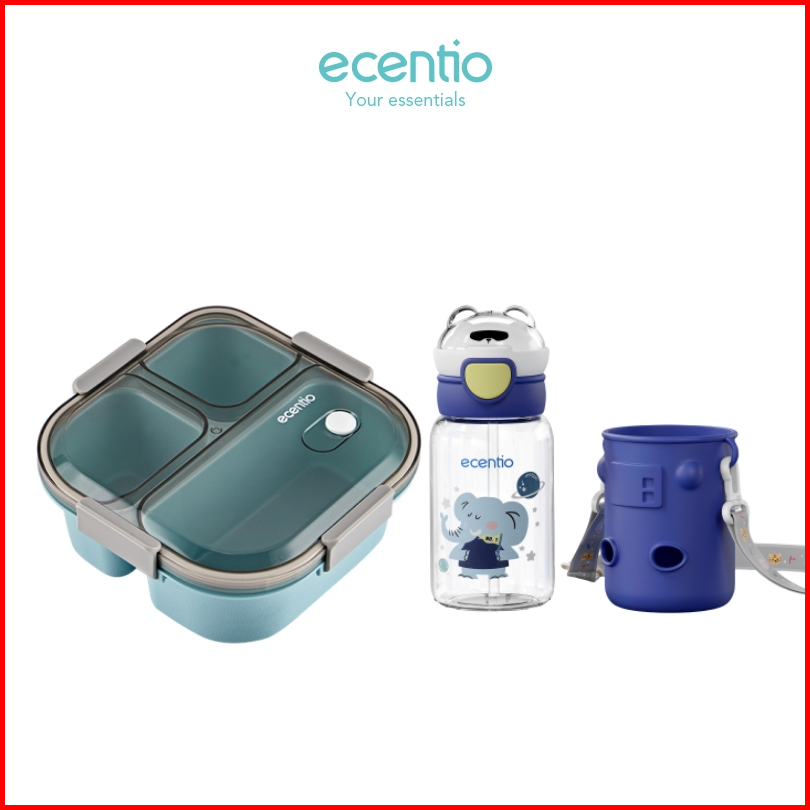 Ecentio Tempat Makan 3 Sekat Set Lunch Box Botol Anak Kotak Bekal Sendok Makanan Biru