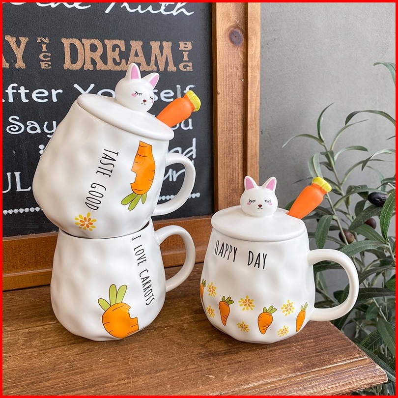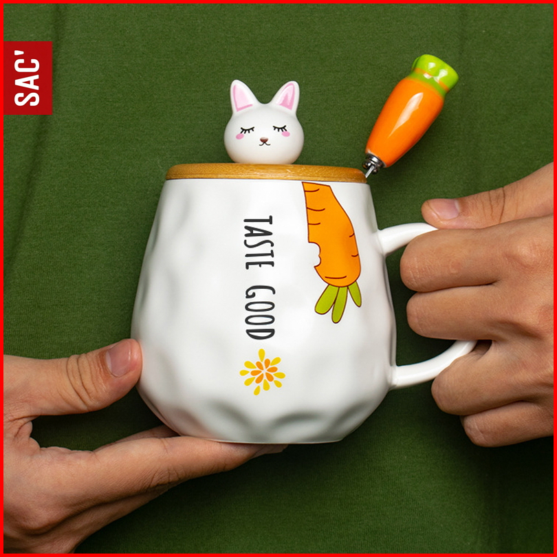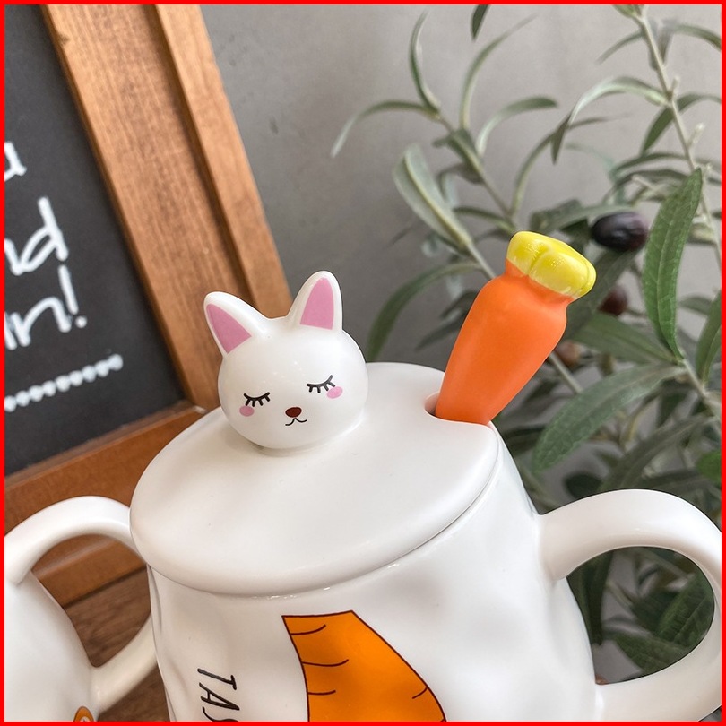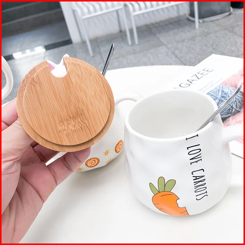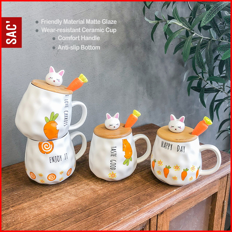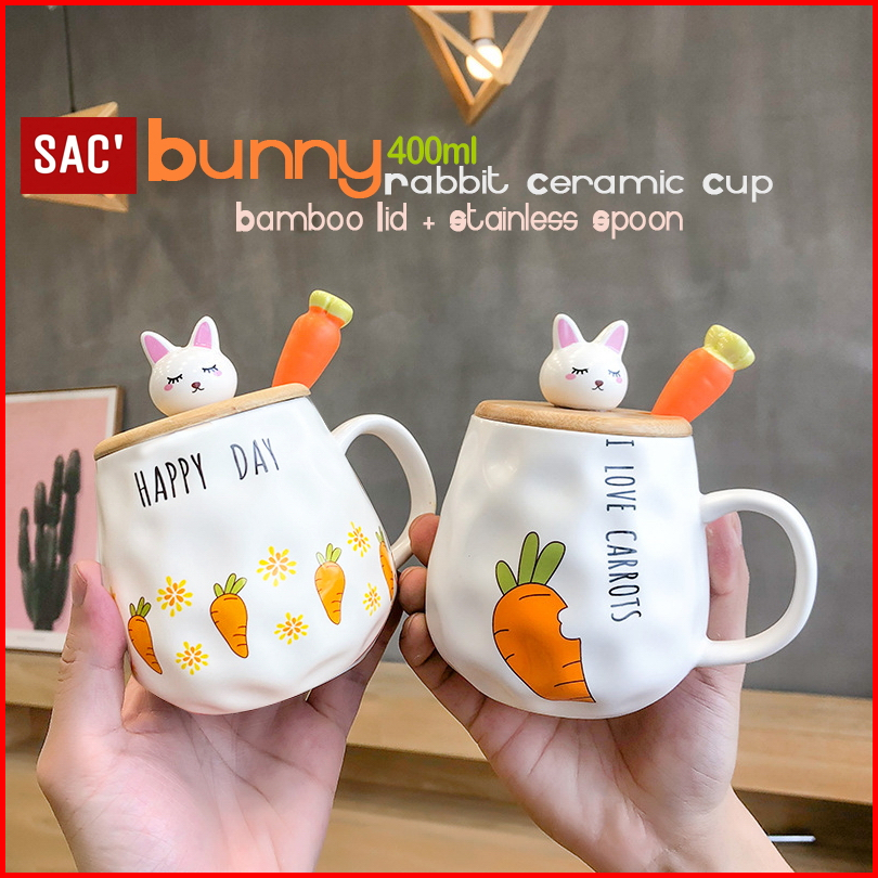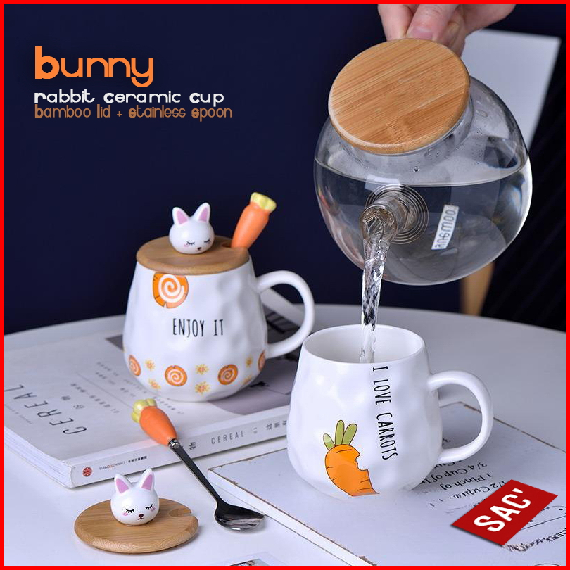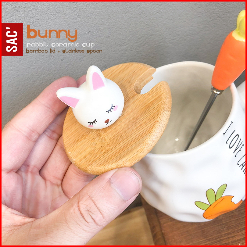 Bunny Rabbit Ceramic Cup Mug Gelas Kopi Susu Keramik Tutup Kayu Sendok Stainless Gelas Anak Karakter Kartun Kelinci Lucu