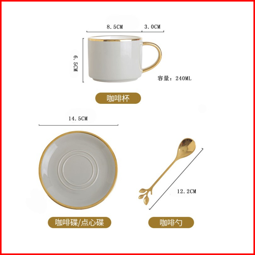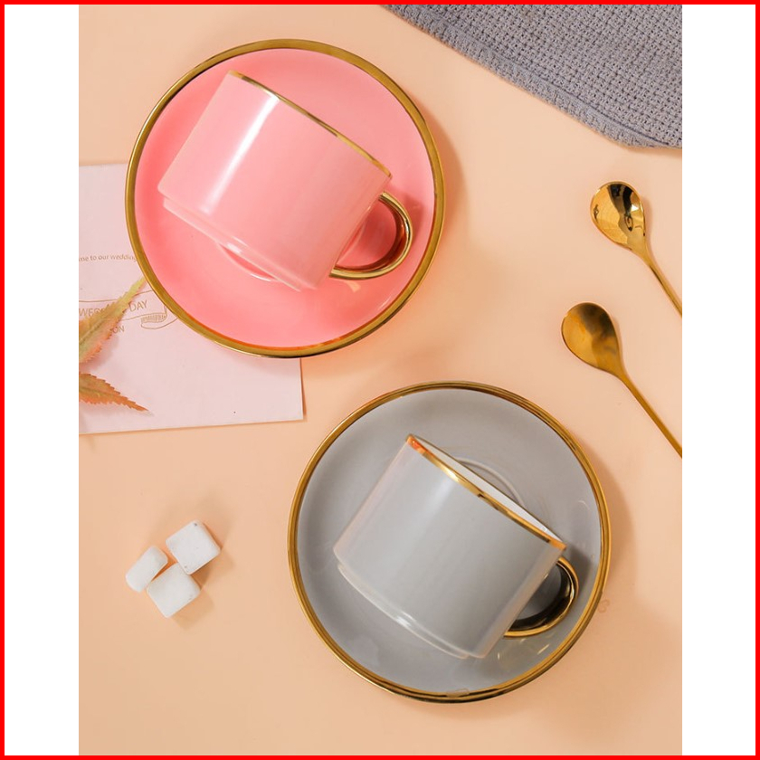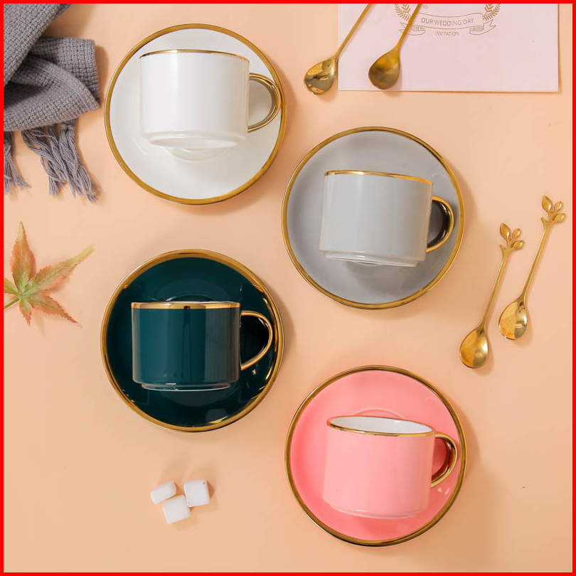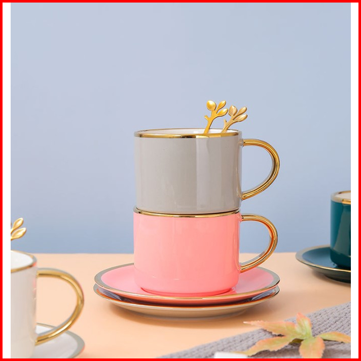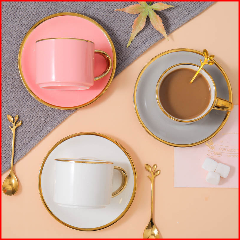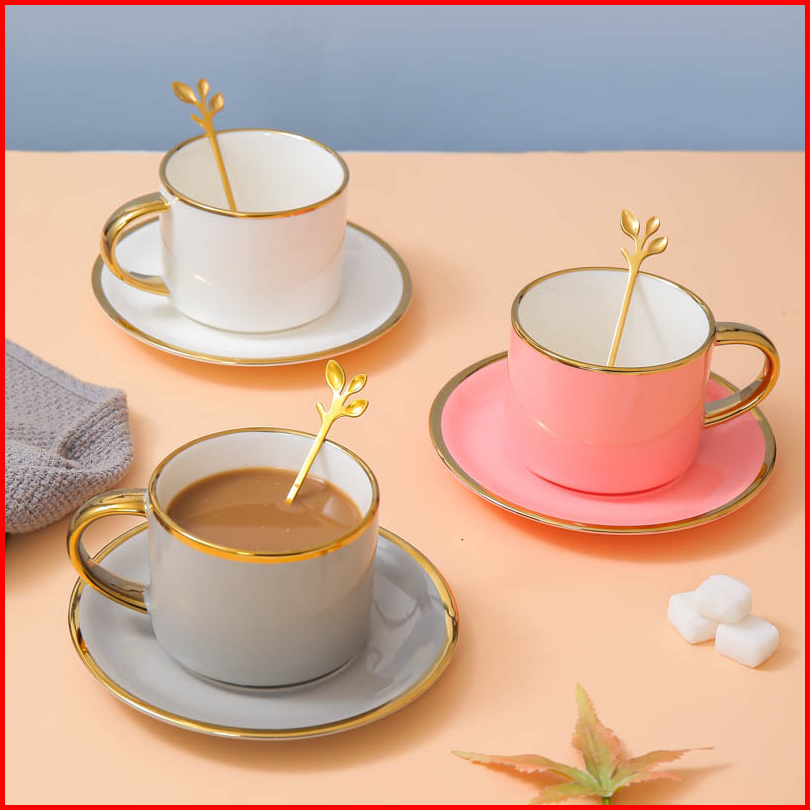 Ashome Cangkir Keramik Glossy List Elegan Dengan Sendok Dan Piring Ceramic Tea Cup Elegant Cangkir Kopi Aestetik Cangkir