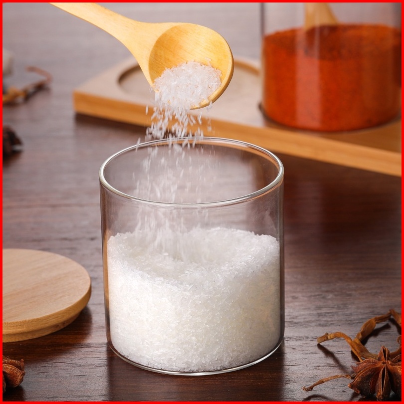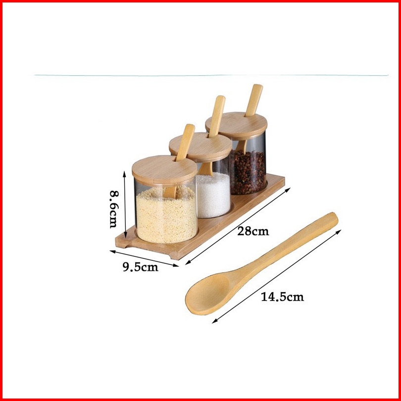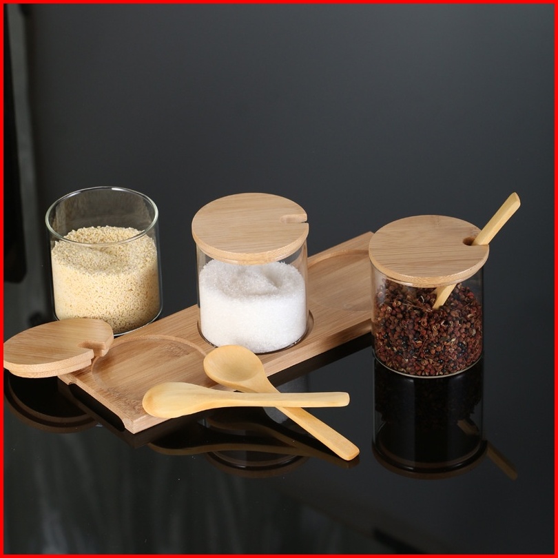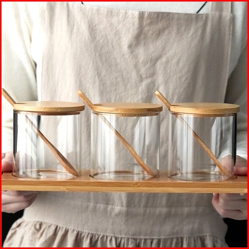 Tempat Bumbu Kaca Set Isi 3 Toples Dengan Alas Dan Penutup Kayu Vintage Storage Jar Seasoning Jar Rak Bumbu Set Toples P
