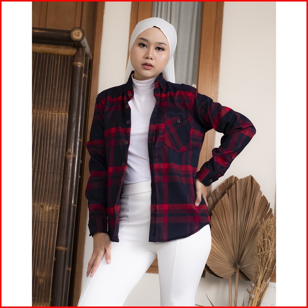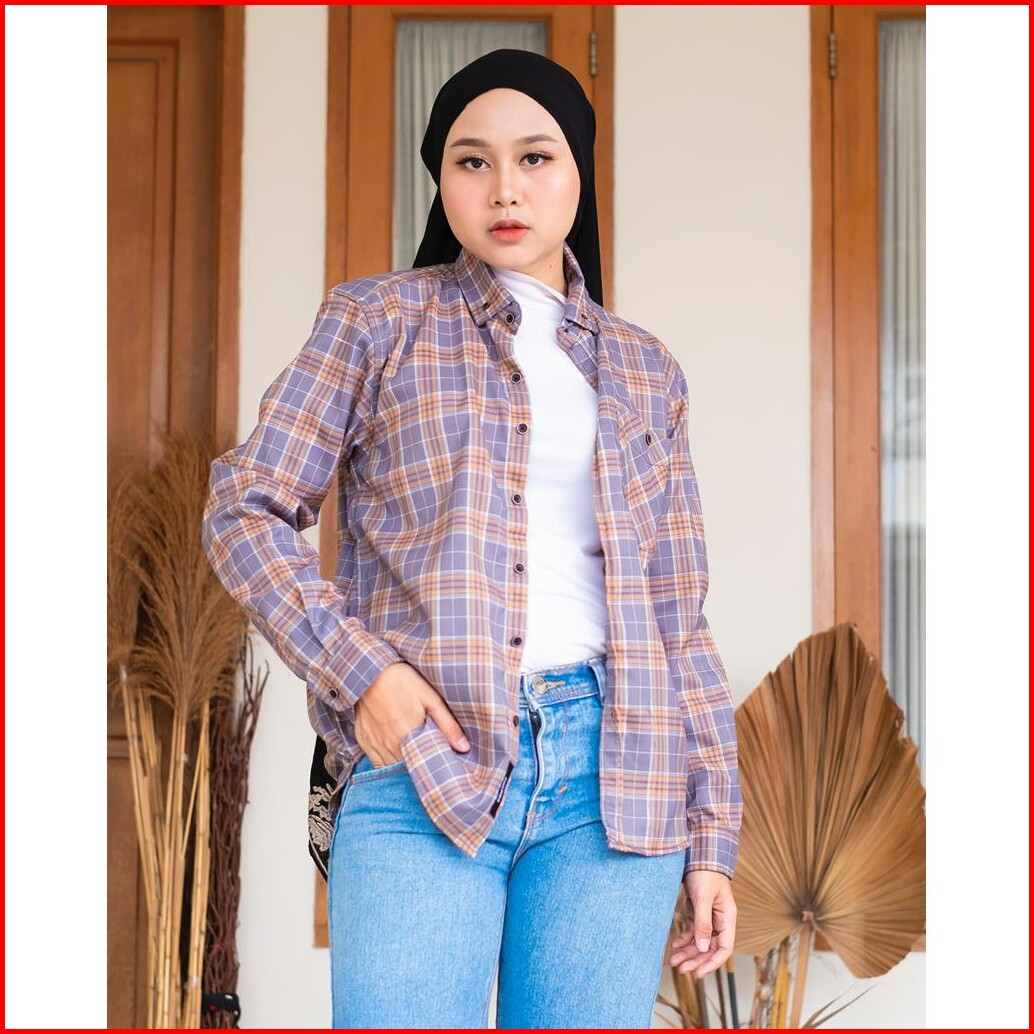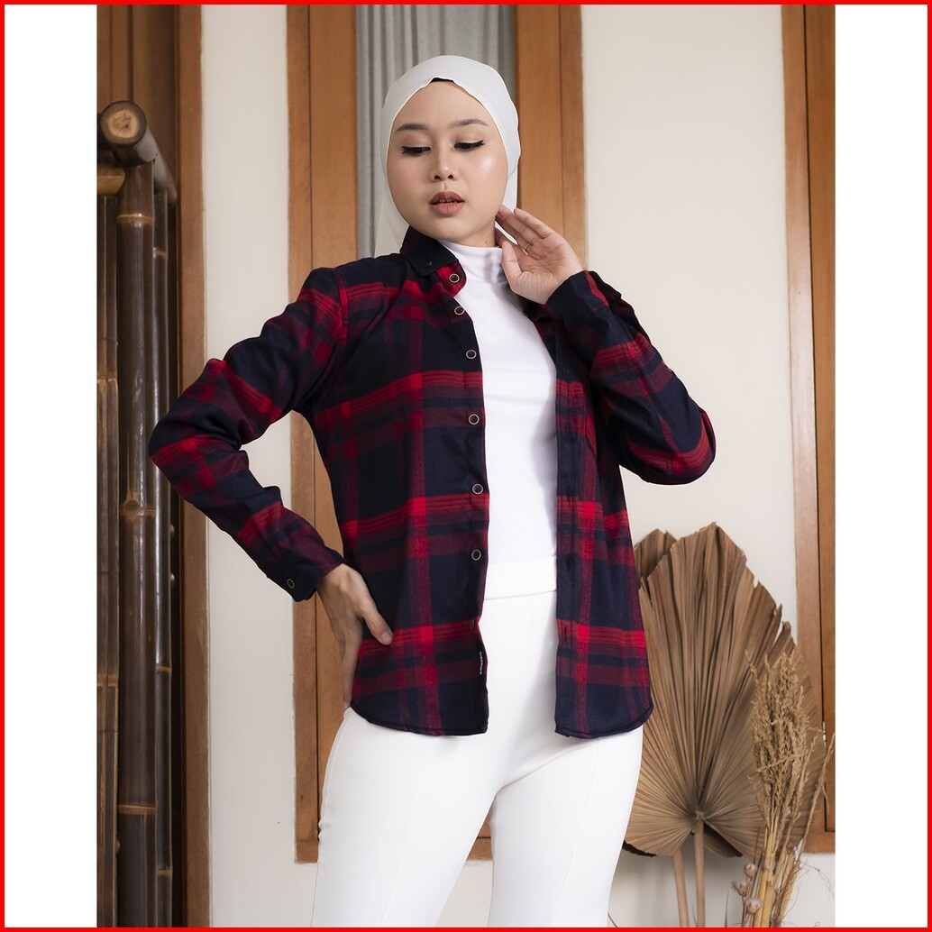 Haymeeidn - Kemeja Flanel Wanita Lengan Panjang Baju Atasan Cewe Motif Kotak