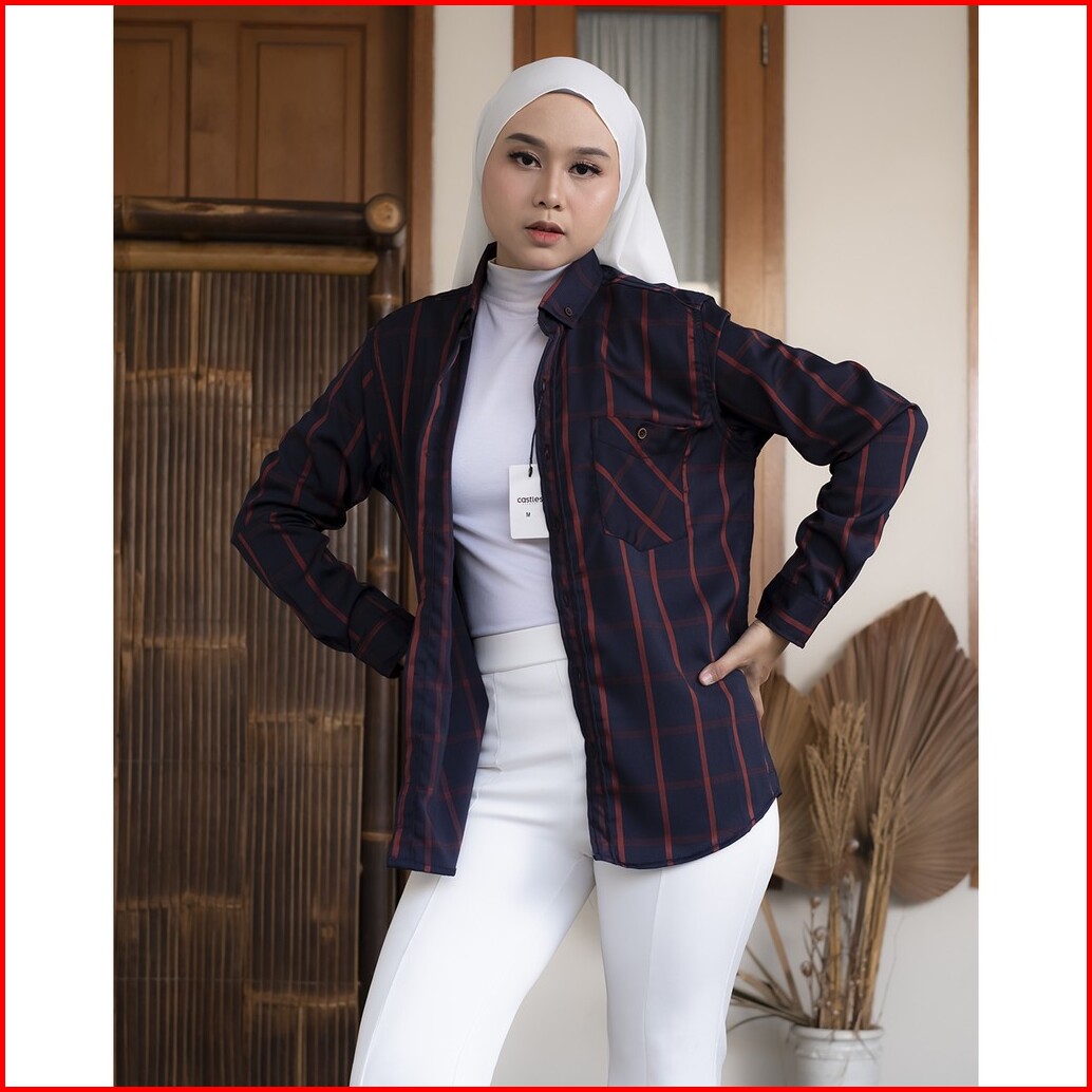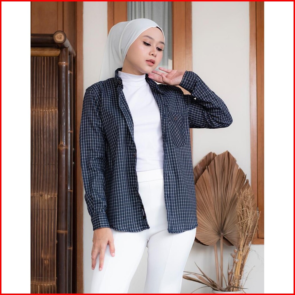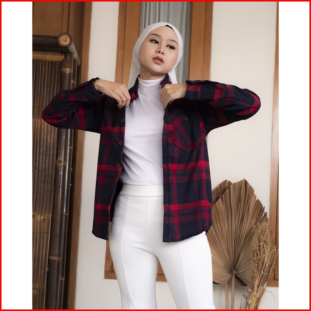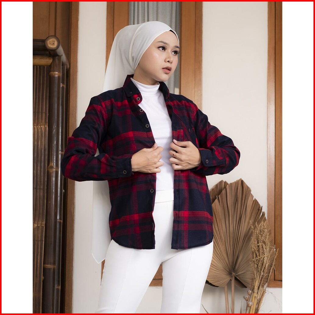 Haymeeidn - Kemeja Flanel Wanita Lengan Panjang Baju Atasan Cewe Motif Kotak