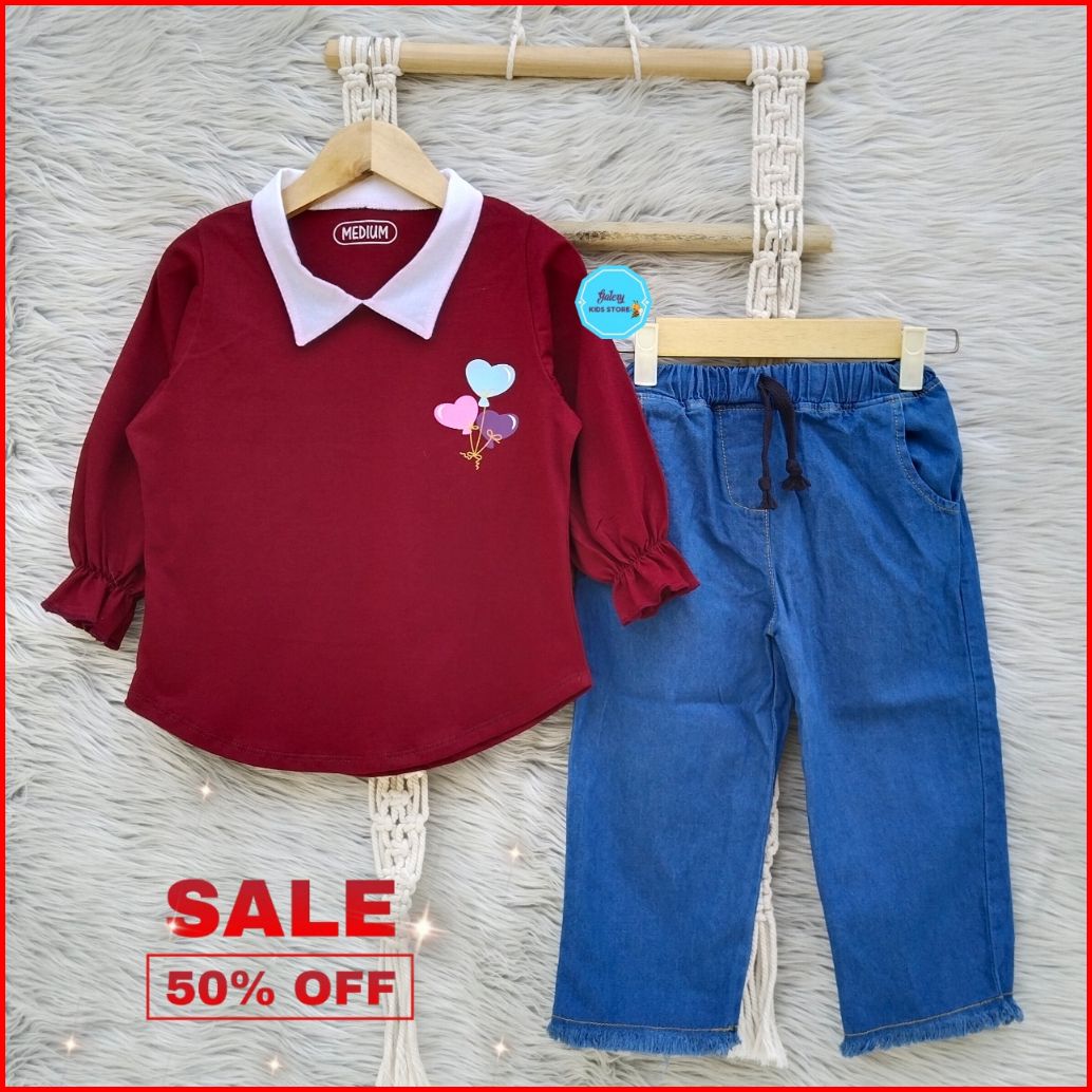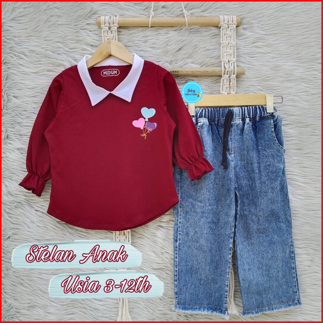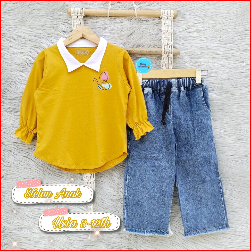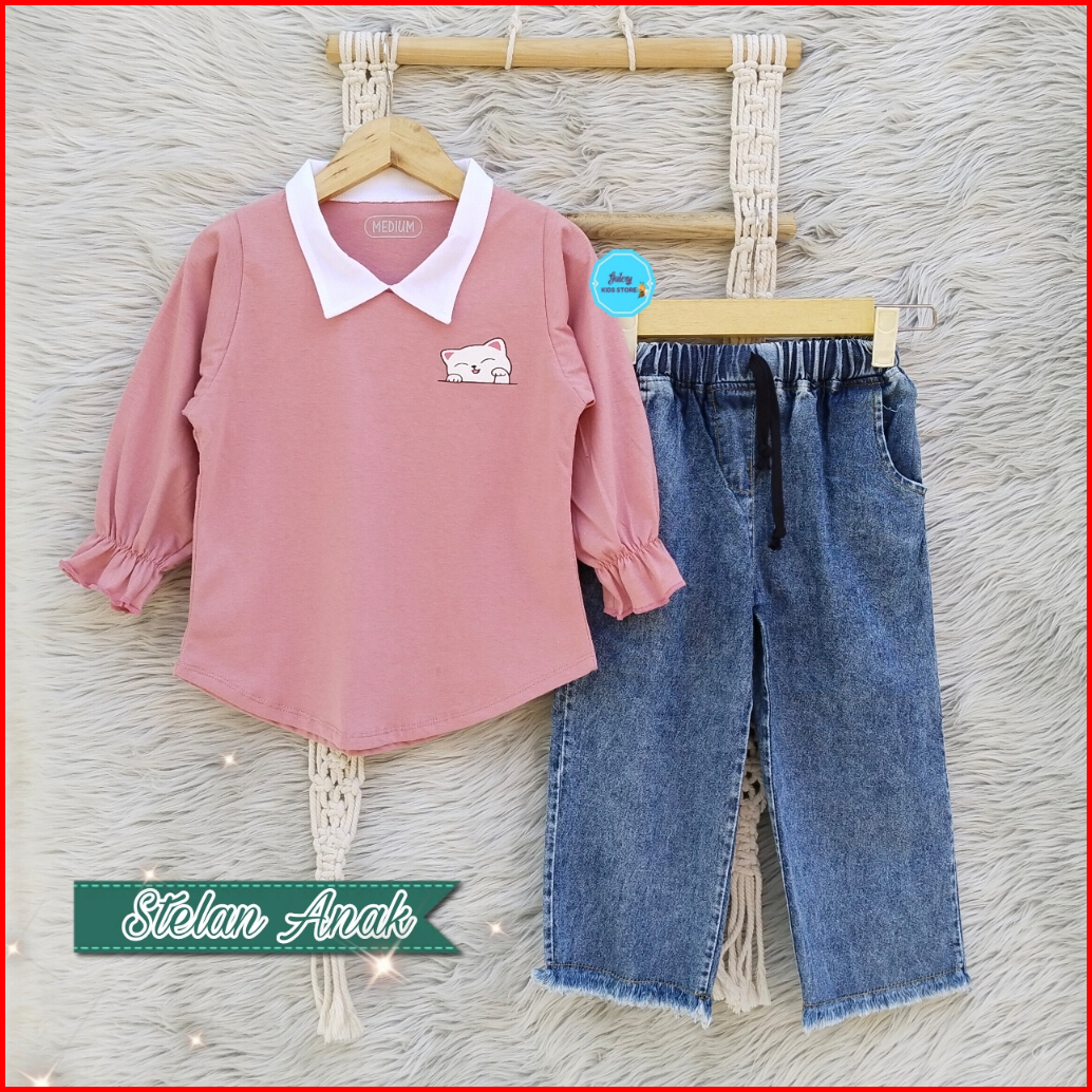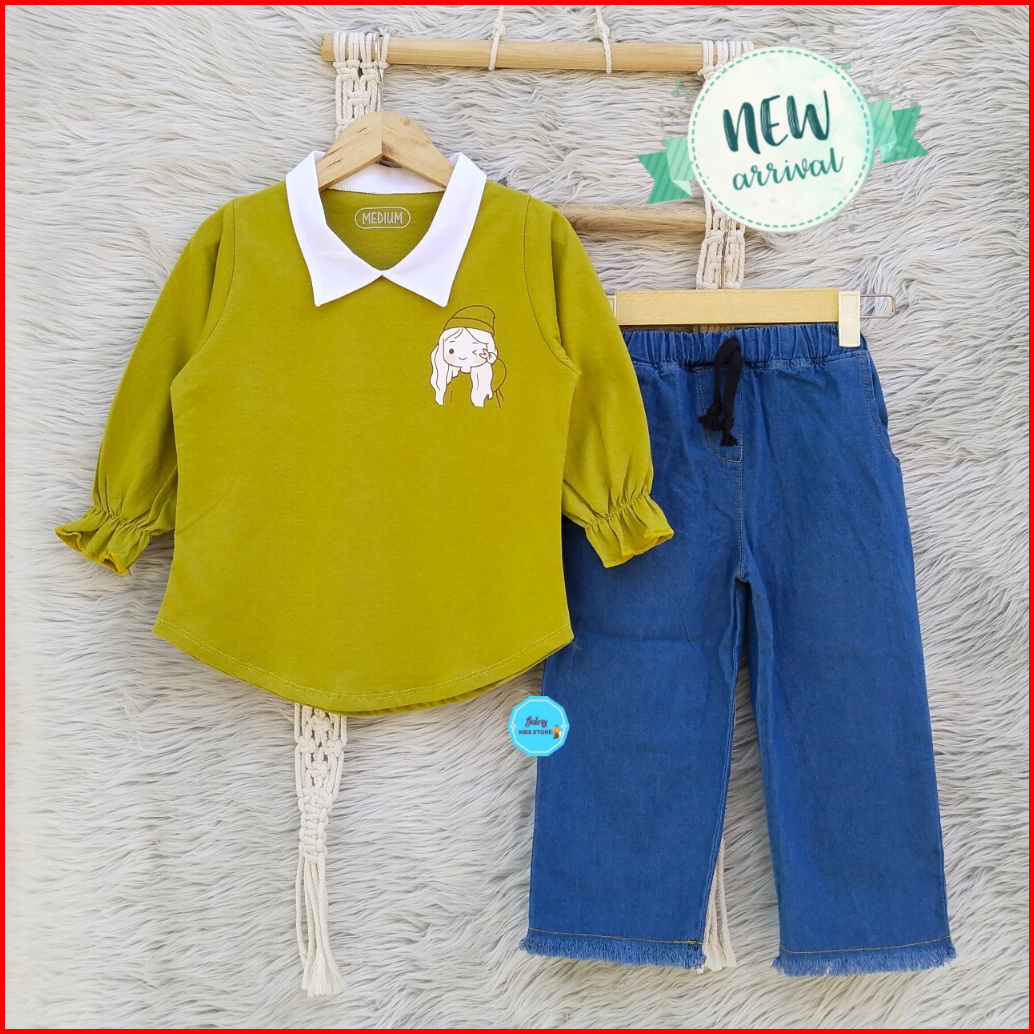 Galery Kids Setelan Kaos Anak Perempuan Lengan Panjang Umur 3-12 Tahun Katun Combed Denim Kulot Cewek Setelan