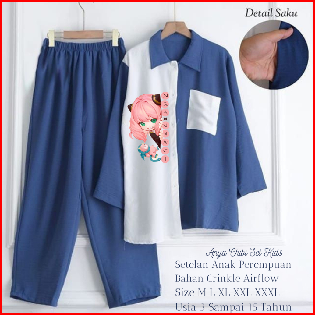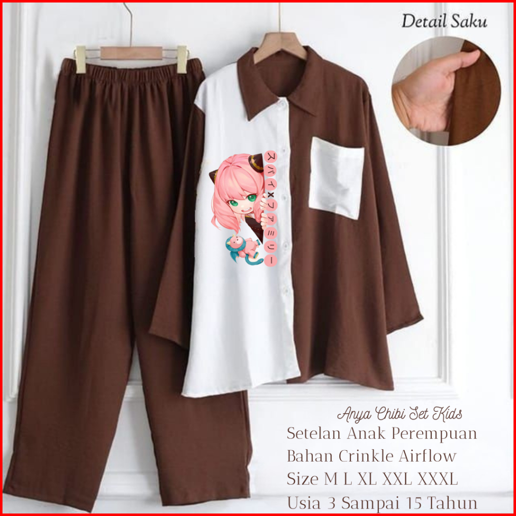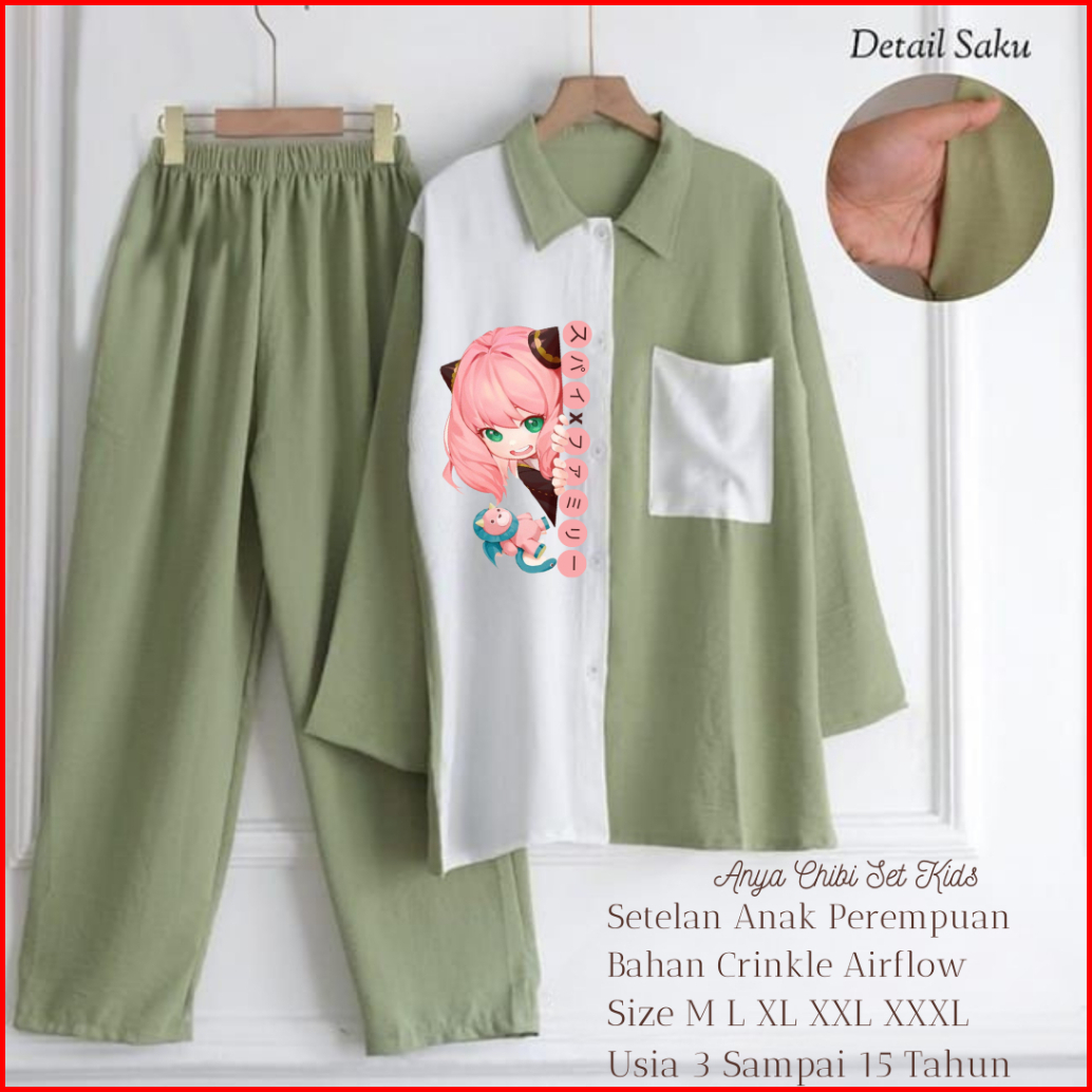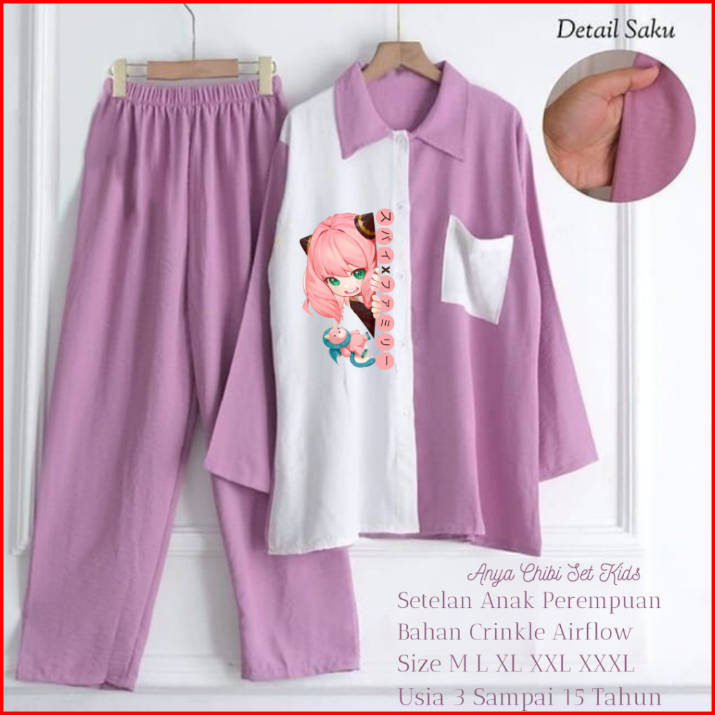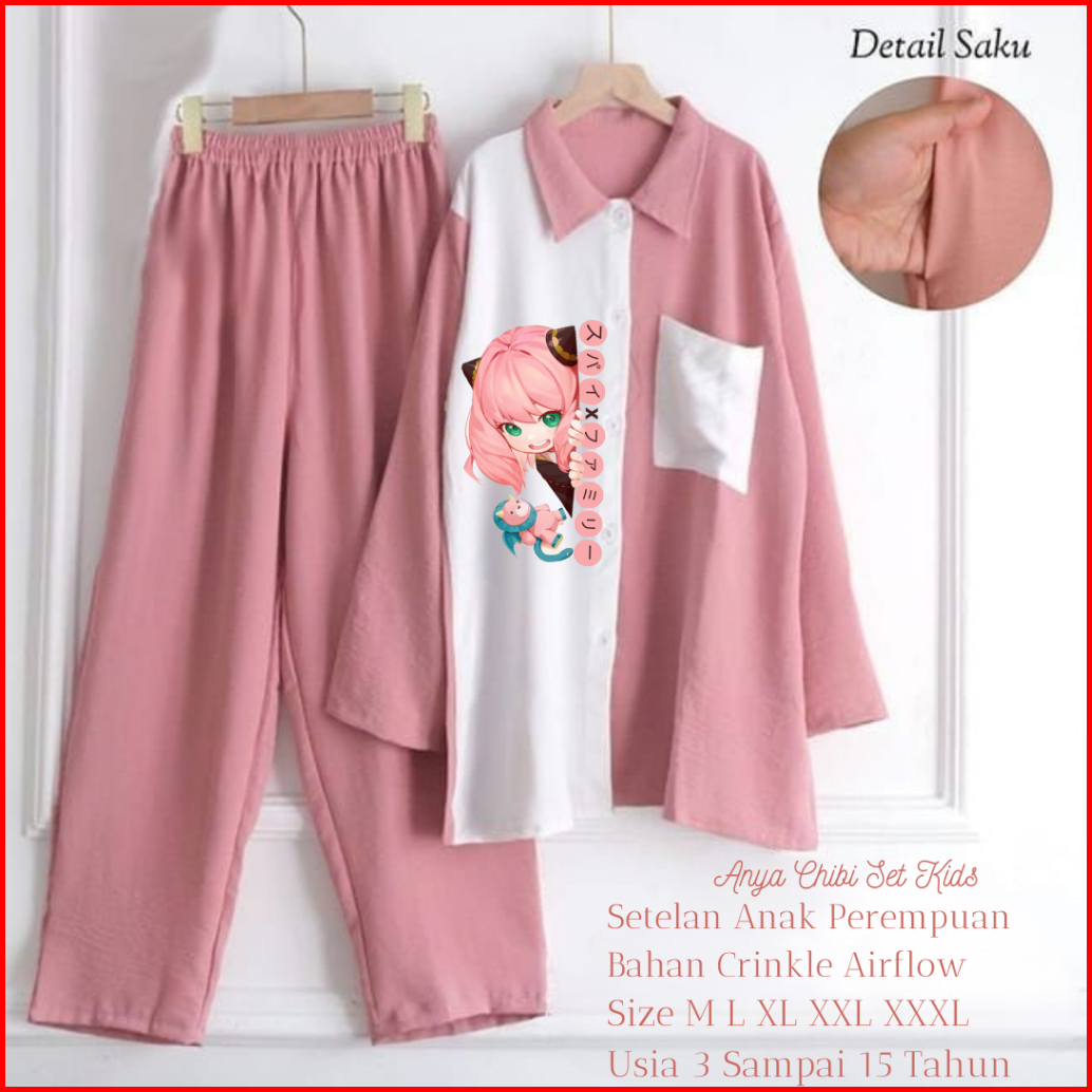 Setelan Anak Perempuan Terbaru 2025 Valin Set 2in 1 Two Tone Color Anya Chibi Set Kids Crinkle Airflow Baju Cosplay Anya