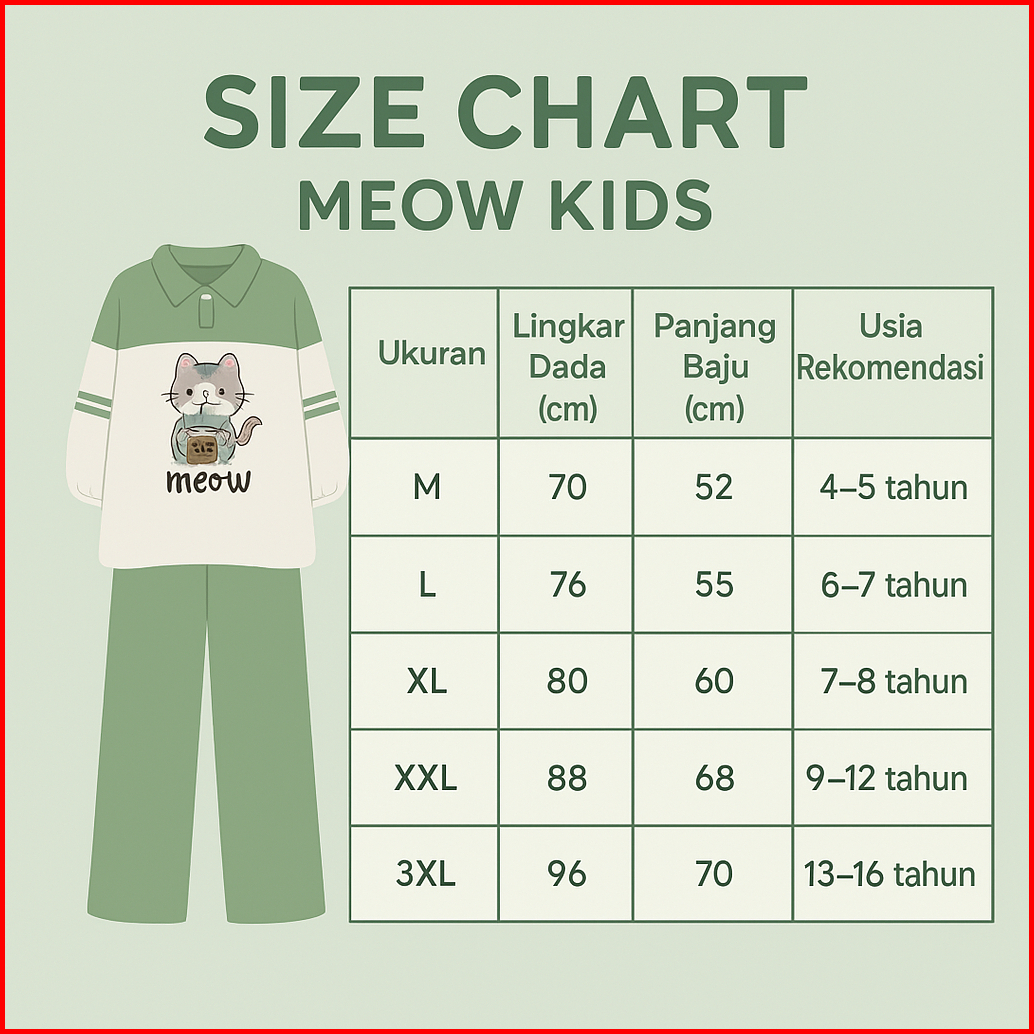 M (4-5tahun), L(6-7tahun), XL (7-8tahun), XXL(9-13tahun), XXXL(13-16tahun)