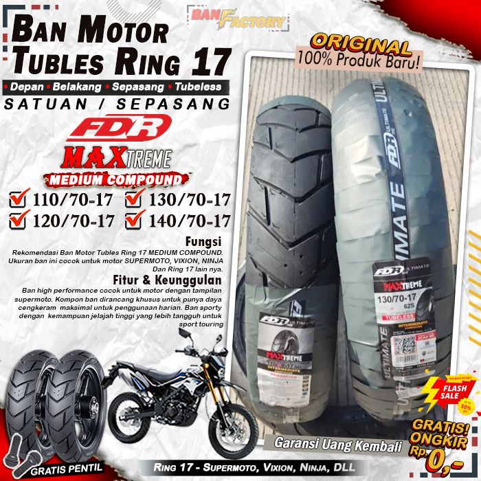 Ban Motor Tubeless FDR Maxtreme Ring 17 Ban Motor Vixion Ninja Supra Satria Tubles Depan Belakang Sepasang Ring 17