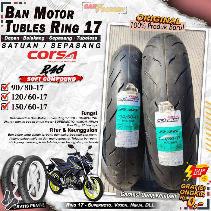 Ban Motor Tubeless Corsa R46 Ring 17 Ban Motor Vixion Ninja R15 Tubles Depan Belakang Sepasang Ring 17
