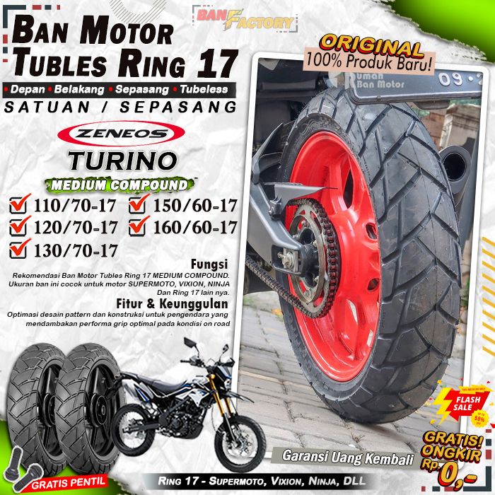 Ban Motor Tubeless Zeneos Turino Ring 17 Ban Motor Vixion Ninja R15 Tubles Depan Belakang Sepasang Ring 17