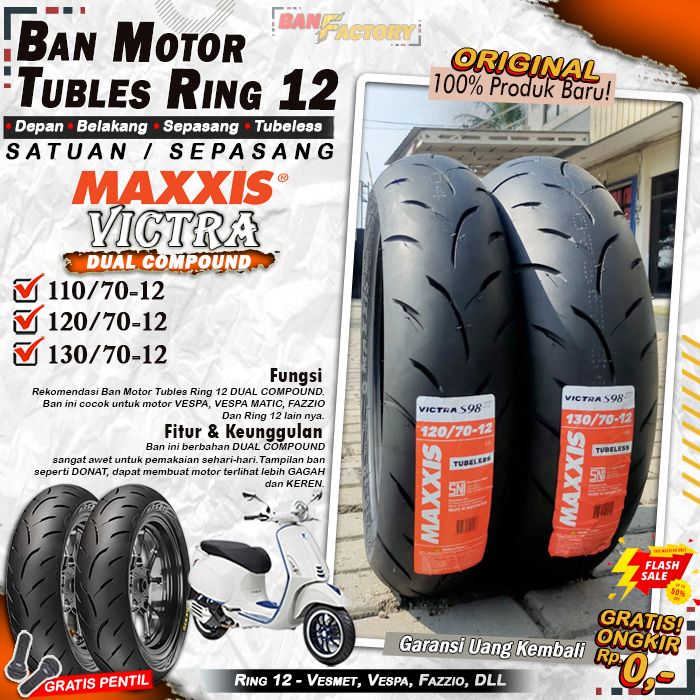 Sepasang Ban Motor Tubles Vespa MAXXIS VICTRA Ring 12 Ban Motor Depan Belakang Tubeless Vespa Fazzio Ring 12