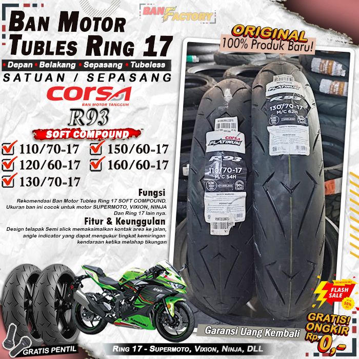 Ban Motor Tubeless Corsa R93 Ring 17 Ban Motor Vixion Ninja R15 Tubles Depan Belakang Sepasang Ring 17