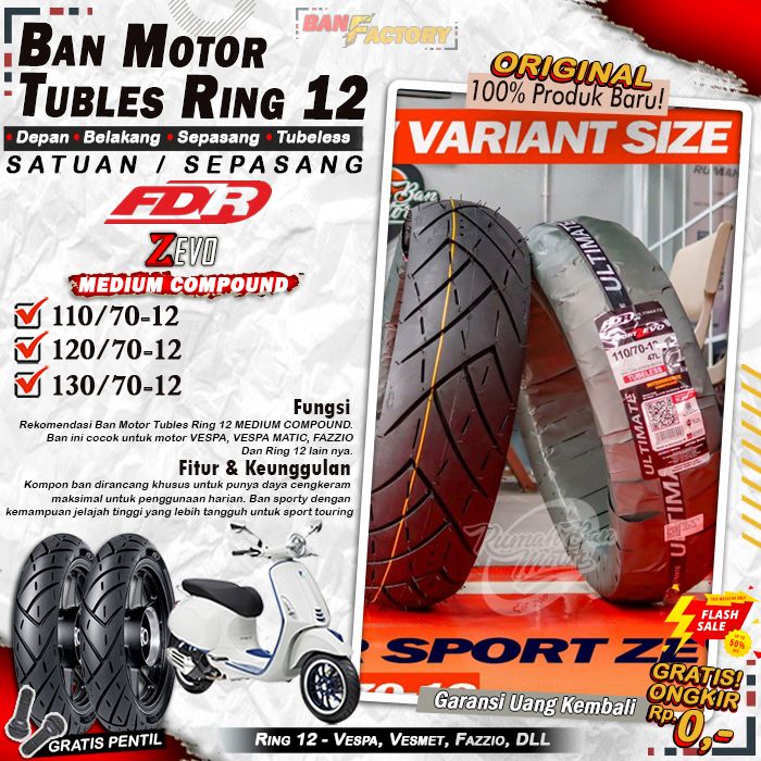 Ban Motor Matic Tubeless FDR Zevo Ring 12 Ban Motor Vespa Tubles Depan Belakang Sepasang Ring 12
