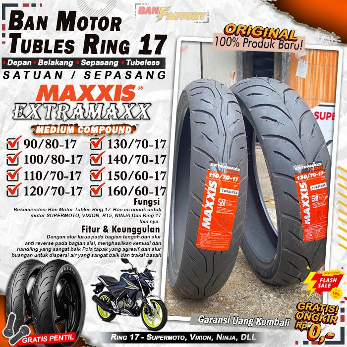 Ban Motor Tubeless Maxxis Extramaxx Ring 17 Ban Motor Vixion Ninja Satria Supra Tubles Depan Belakang Sepasang Ring 17