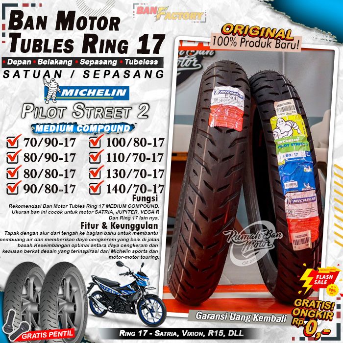 Ban Motor Tubeless Michelin Pilot Street 2 Ring 17 Ban Motor Vixion Ninja Satria Tubles Depan Belakang Sepasang Ring 17