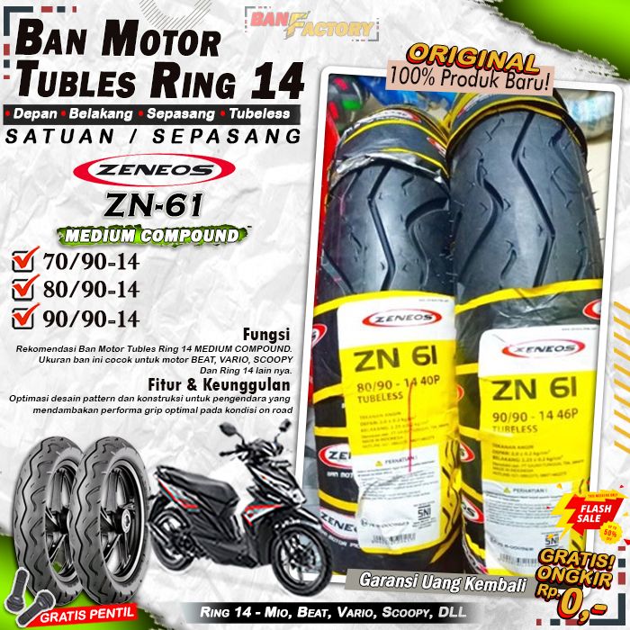 Ban Motor Matic Tubeless Zeneos ZN61 Ring 14 Ban Motor Beat Vario Scoopy Tubles Depan Belakang Sepasang Ring 14