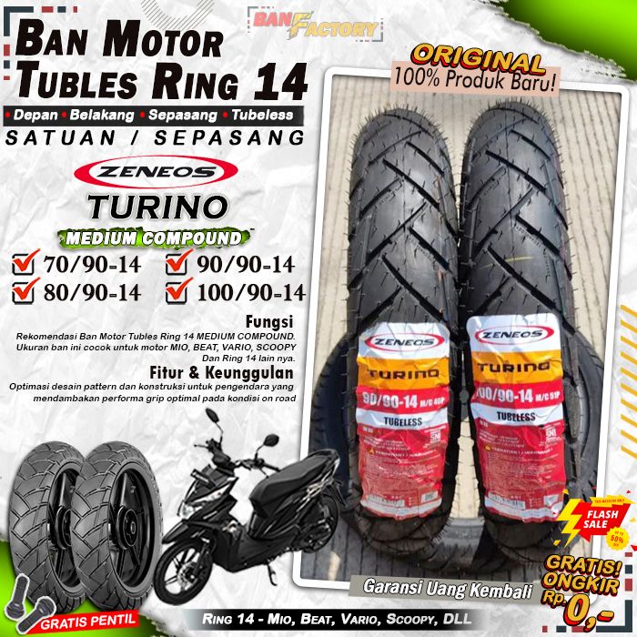 Ban Motor Matic Tubeless Zeneos Turino Ring 14 Ban Motor Beat Vario Scoopy Tubles Depan Belakang Sepasang Ring 14
