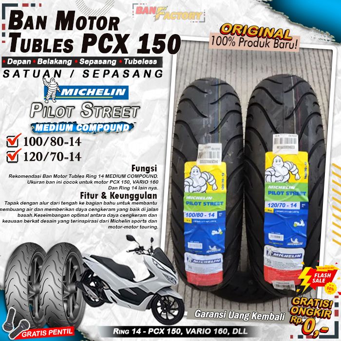 Sepasang Ban Motor Tubles PCX 150 VARIO 160 Michelin Pilot Street Ring 14 Ban Motor Tubeless Depan Belakang PCX Ring 14