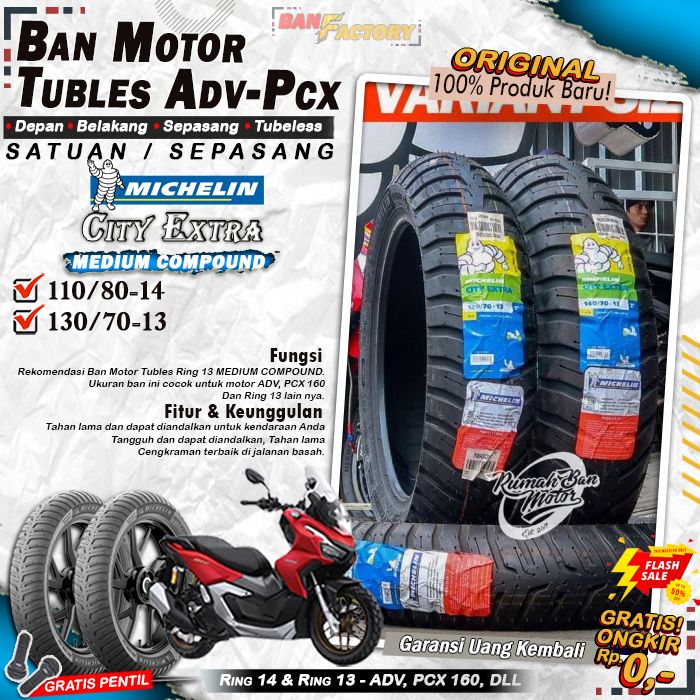 Sepasang Ban Motor Tubles ADV PCX 160 Michelin City Extra Ring 14 Ring 13 Ban Motor Depan Belakang ADV PCX Ring 14