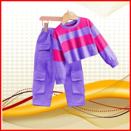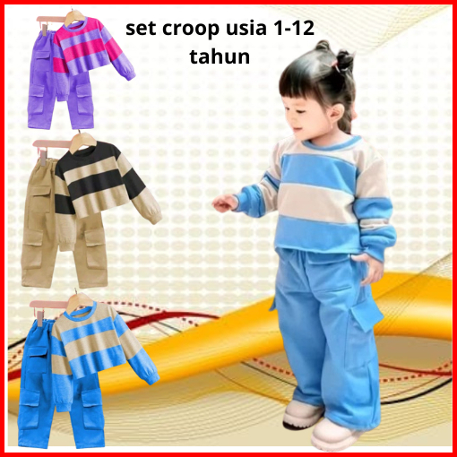 Oneset Crop Cargo Sweatpants Stripe Setelan Anak Perempuan Usia 1-12 Tahun