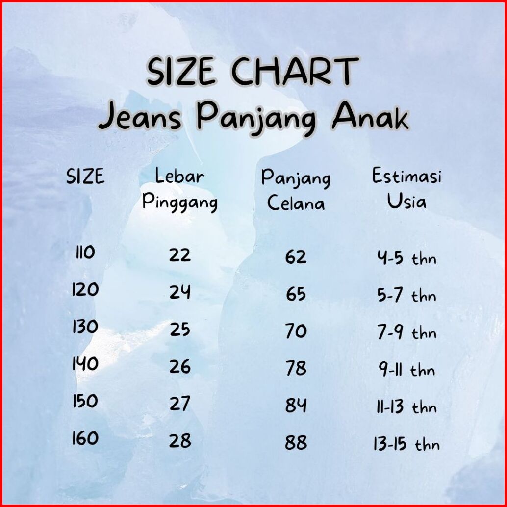 Size 110(4-5 tahun), Size 120(5-7 tahun), Size 130(7-9 tahun), Size 140(9-11 tahun), Size 150(11-13 tahun, Size 160(13-15 tahun