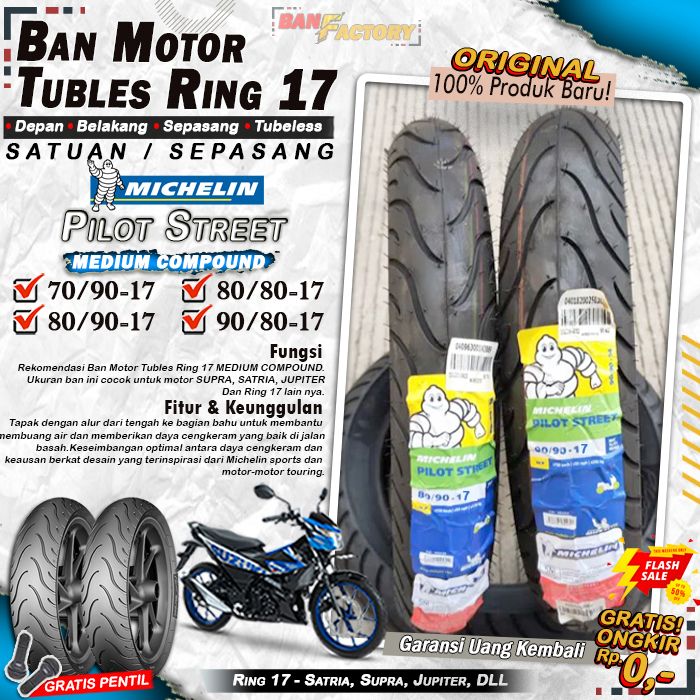 Ban Motor Tubeless Michelin Pilot Street Ring 17 Ban Motor Vixion Ninja Satria Tubles Depan Belakang Sepasang Ring 17