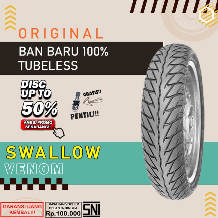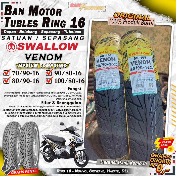 Ban Motor Matic Tubeless Swallow Venom Ring 16 Ban Motor Nouvo Skywave Hayate Tubles Depan Belakang Sepasang Ring 16