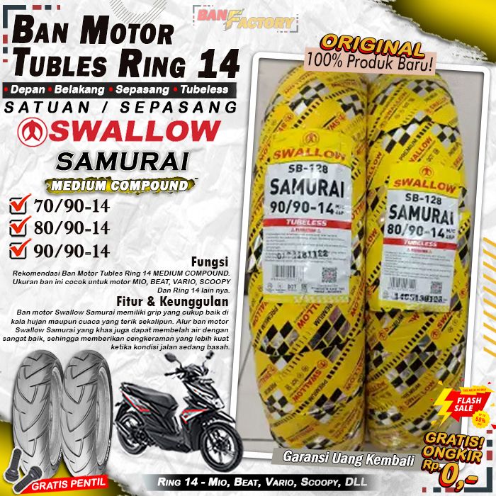 Ban Motor Matic Tubeless Swallow Samurai Ring 14 Ban Motor Beat Vario Scoopy Tubles Depan Belakang Sepasang Ring 14