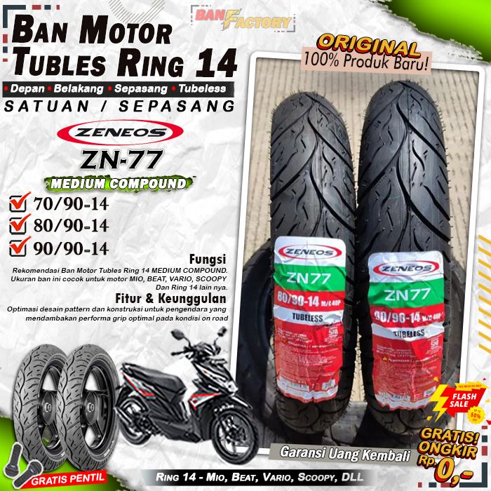 Ban Motor Matic Tubeless Zeneos ZN77 Ring 14 Ban Motor Beat Vario Scoopy Tubles Depan Belakang Sepasang Ring 14