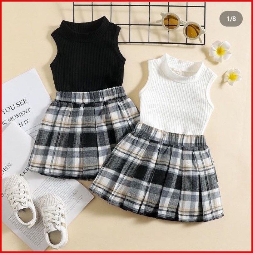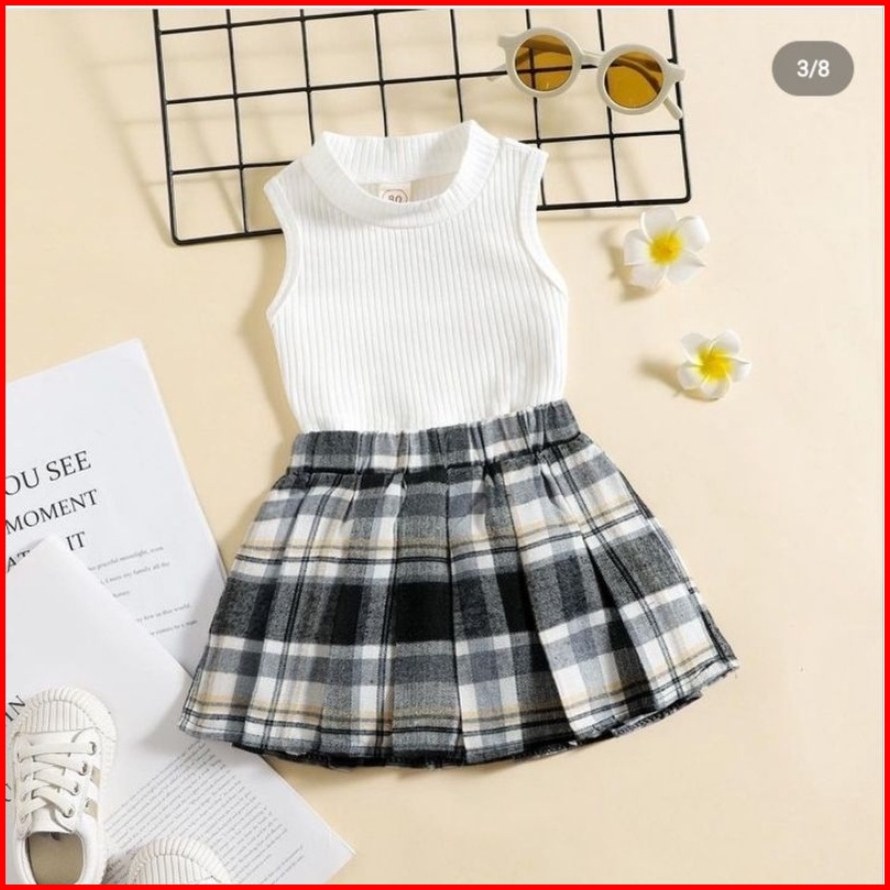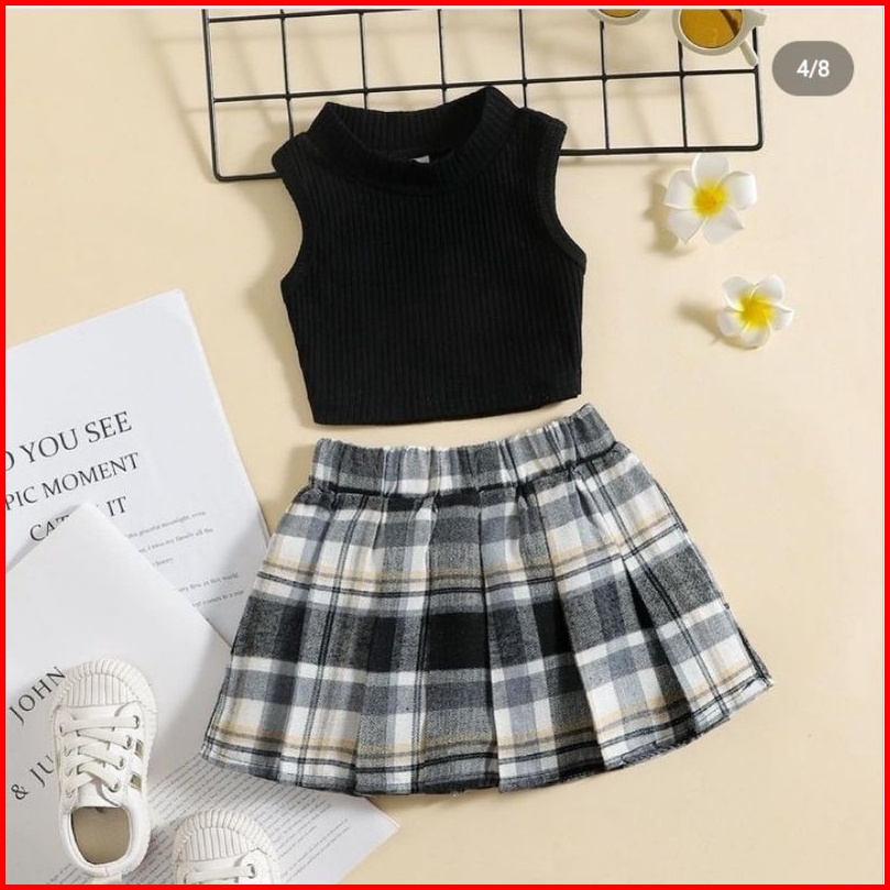 Littleflamingo Inc Setelan Baju Crop Top Anak Perempuan Rok Kotak-kotak Kekinian